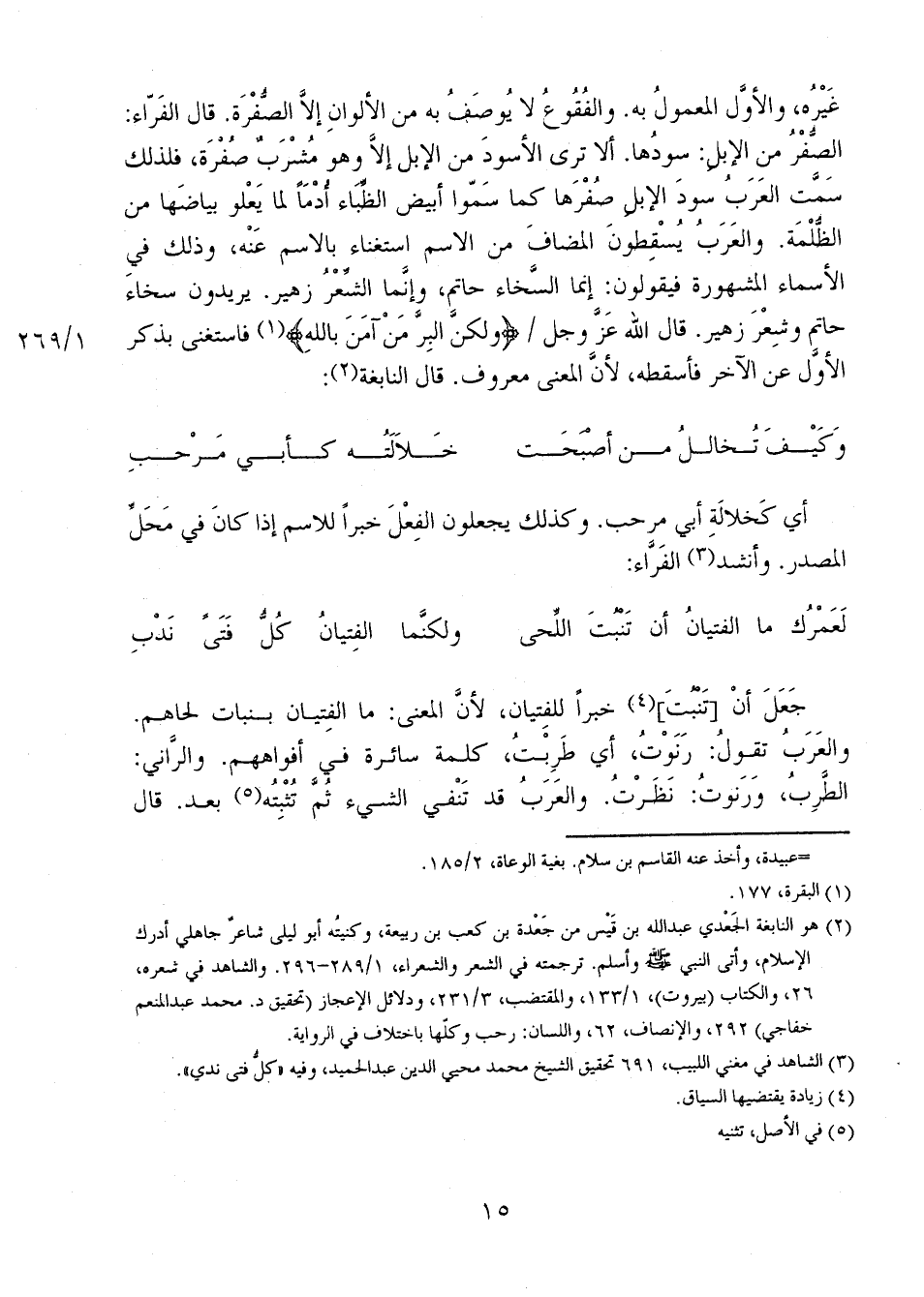غيره، والأول المعمولُ به. والفُقوعُ لا يوصف به من الألوان إلا الصفرة. قال الفراء: الصفرُ من الإبل: سودها. ألا ترى الأسود من الإبل إلا وهو مُشْرَبٌ صُفْرَة، فلذلك سمت العربُ سود الإبل صُفْرَها كما سموا أبيض الظباء أدماً لما يعلو بياضها من الظلمة. والعربُ يسقطون المضاف من الاسم استغناء بالاسم عنه، وذلك في الأسماء المشهورة فيقولون: إنما السخاء حاتم، وإنما الشعر زهير. يريدون سخاء حاتم وشعر زهير. قال الله عز وجل 1/ 269 {وَلَكِنَّ الْبِرَّ مَنْ آمَنَ بِاللَّهِ} فاستغنى بذكر الأول عن الآخر فأسقطه، لأن المعنى معروف. قال النابغة: