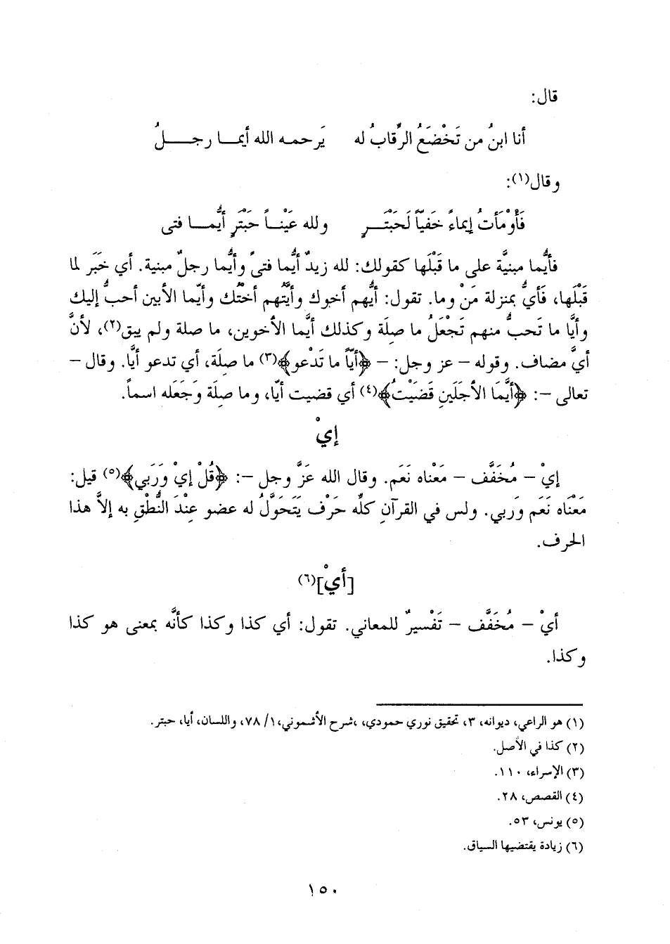إي- مُخفَّف- معناه نعم. وقال الله عز وجل-: {قُلْ إِي وَرَبِّي} قيل: معناه نعم وربي. وليس في القرآن كله حرف يتحولُ له عضو عند النُّطْقِ به إلا هذا الحرف.