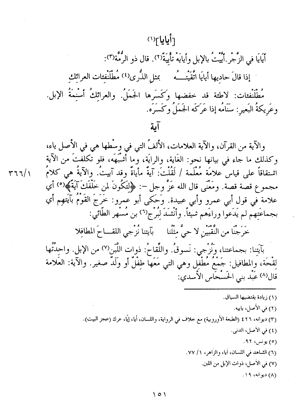 والآية من القرآن، والآية العلامات، الألفُ التي في وسطها هي في الأصل ياء، وكذلك ما جاء في بيانها نحو: الغاية، والراية، وما أشبهه، فلو تكلفت من الآية اشتقاقاً على قياس علامة مُعْلَمة 1/ 366 لقُلْتَ: آيةُ مأياةٌ وقد آييتُ. والآيةُ هي كلامُ مجموع قصة قصة. ومعنى قال الله عز وجل-: {لِتَكُونَ لِمَنْ خَلْفَكَ آيَةً} أي علامة في قول أبي عمرو وأبي عبيدة. وحكى أبو عمرو: خرجَ القوْمُ بآيتهم أي بجماعتهم لم يدعوا وراءهم شيئاً. وأنشد لِبُرْج بن مُسْهر الطائي: