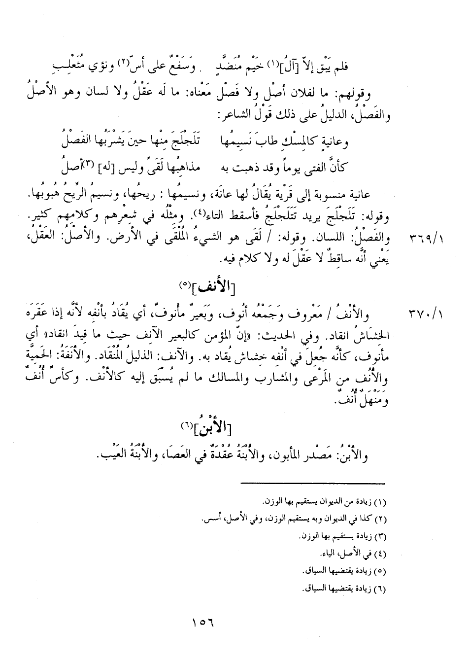 والأنفُ 1/ 370 معروف وجمعُه أنوف، وبعير مأنوفٌ، أي يُقادُ بأنفه لأنَّه إذا عقَرَه الخِشَاش انقاد. وفي الحديث: "إن المؤمن كالبعير الآنف حيث ما قيد انقاد" أي مأنوف، كأنَّه جُعِلَ في أنْفِه خِشاش يُقاد به. والآنف: الذليلُ المُنْقَاد. والأنَفَةُ: الحمِيَّة والأنُف من المرعى والمشارب والمسالك ما لم يُسْبَق إليه كالأنْف. وكأسٌ أنفٌ ومنهلٌ أنُفٌ.
