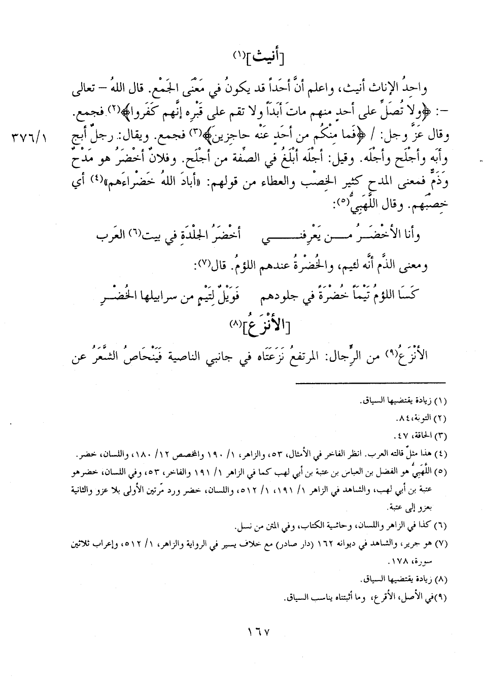 واحدُ الإناث أنيث، واعلم أنَّ أحداً قد يكون في معنى الجمع. قال الله - تعالى-: {وَلا تُصَلِّ عَلَى أَحَدٍ مِنْهُمْ مَاتَ أَبَداً وَلا تَقُمْ عَلَى قَبْرِهِ إِنَّهُمْ كَفَرُوا} فجمع. وقال عز وجل: 1/ 376 {فَمَا مِنْكُمْ مِنْ أَحَدٍ عَنْهُ حَاجِزِينَ} فجمع. ويقال: رجل أبجٍ وأبه وأجْلَح وأجْلَه. وقيل: أجْلَه أبْلَغُ في الصفة من أجْلَح. وفلانٌ أخضرُ هو مدحٌ وذمٍّ فمعنى المدح كثير الخصب والعطاء من قولهم: "أباد الله خضراءهم" أي خصبهم. وقال اللهبي: