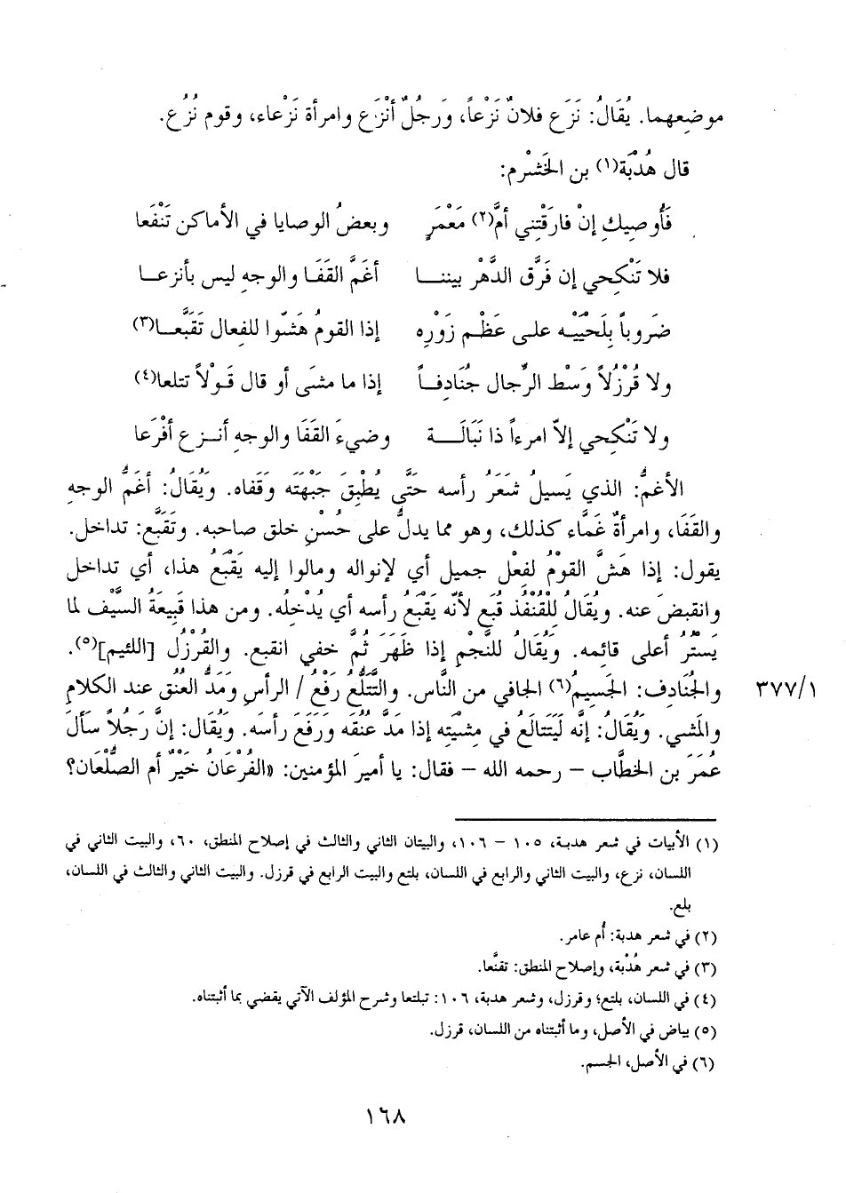 الأغمُّ: الذي يسيلُ شَعَرُ رأسه حتى يُطْبِقَ جَبْهَتَه وقفاه. ويُقال: أغَمُّ الوجه والقفا، وامرأةٌ غَمَّاء كذلك، وهو مما يدل على حُسن خلق صاحبه. وتقبع: تداخل. يقول: إذا هشَّ القومُ لفعل جميل أي لإنواله ومالوا إليه يقبعُ هذا، أي تداخل وانقبض عنه. ويُقالُ للقُنْفُذ قُبَع لأنه يَقْبَعُ رأسه أي يُدْخِلُه. ومن هذا قبيعةُ السَّيْف لما يستُرُ أعلى قائمه. ويُقال للنَّجْمِ إذا ظهر ثُمَّ خفي انقبع. والقُرْزُل [اللئيم]. والجنادف: الجسيمُ الجافي من الناس. والتَّتَلُّعُ رَفْعُ 1/ 377 الرأس ومدُّ العُنُق عند الكلام والمشي. ويُقال: إنَّه ليتتالعُ في مشيته إذا مدَّ عُنُقَه ورفع رأسه. ويُقال: إن رجلاً سأل عُمر بن الخطاب - رحمه الله- فقال: يا أمير المؤمنين: "الفُرْعَانُ خَيْرٌ أم الصُّلْعَان؟