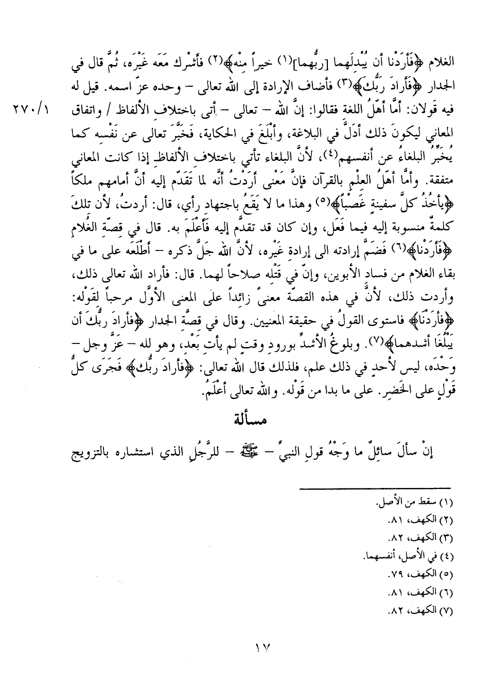 الغلام {فَأَرَدْنَا أَنْ يُبْدِلَهُمَا [رَبُّهُمَا] خَيْراً مِنْهُ} فأشرك معه غيره، ثم قال في الجدار {فَأَرَادَ رَبُّكَ} فأضاف الإرادة إلى الله تعالى - وحده عز اسمه. قيل له فيه قولان: أما أهلُ اللغة فقالوا: إن الله - تعالى- أتى باختلاف الألفاظ 1/ 270 واتفاق المعاني ليكون ذلك أدل في البلاغة، وأبلغ في الحكاية، فخبر تعالى عن نفسه كما يُخبرُ البلغاءُ عن أنفسهم، لأن البلغاء تأتي باختلاف الألفاظ إذا كانت المعاني متفقة. وأما أهلُ العلمِ بالقرآن فإن معنى أردتُ أنه لما تقدم إليه أن أمامهم ملكاً {يَاخُذُ كُلَّ سَفِينَةٍ غَصْباً} وهذا ما لا يقعُ باجتهاد رأي، قال: أردتُ، لأن تلك كلمة منسوبة إليه فيما فعل، وإن كان قد تقدم إليه فاعلم به. قال في قصة الغُلام {فَأَرَدْنَا} فضم إرادته إلى إرادة غيره، لأن الله جل ذكره - أطلعه على ما في بقاء الغلام من فساد الأبوين، وإن في قتله صلاحاً لهما. قال: فأراد الله تعالى ذلك، وأردت ذلك، لأن في هذه القصة معنى زائداً على المعنى الأول مرحباً لقوله: {فَأَرَدْنَا} فاستوى القول في حقيقة المعنيين. وقال في قصة الجدار {فَأَرَادَ رَبُّكَ أَنْ يَبْلُغَا أَشُدَّهُمَا}. وبلوغُ الأشد بورودِ وقتٍ لم يأتِ بعد، وهو لله - عز وجل- وحده، ليس لأحدٍ في ذلك علم، فلذلك قال الله تعالى: {فَأَرَادَ رَبُّكَ} فجرى كل قولٍ على الخضر. على ما بدا من قوله. والله تعالى أعلمُ.