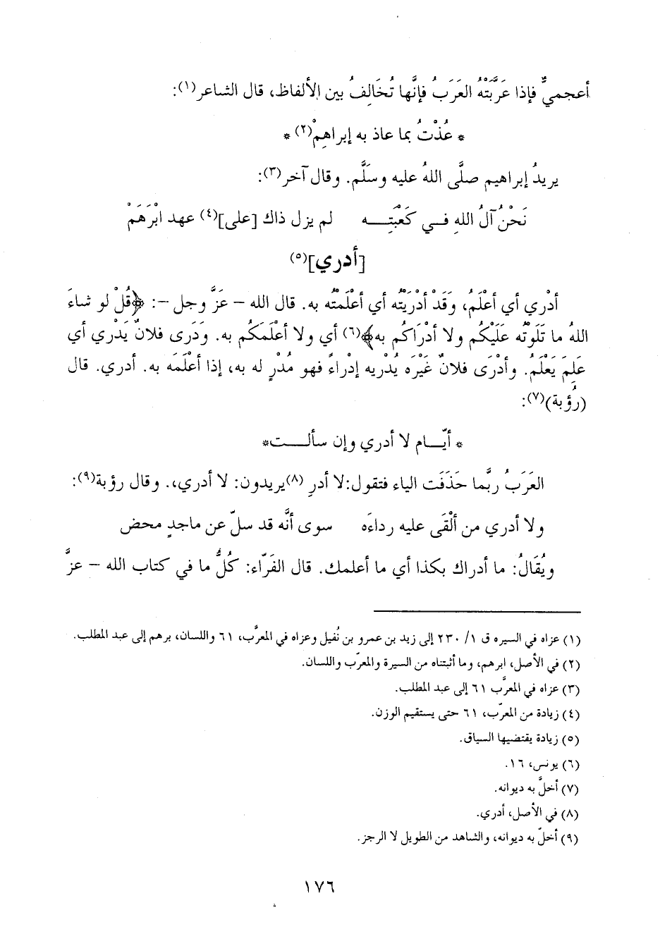 العربُ ربَّما حذفت الياء فتقول: لا أدرِ يريدون: لا أدري، وقال رؤبة: