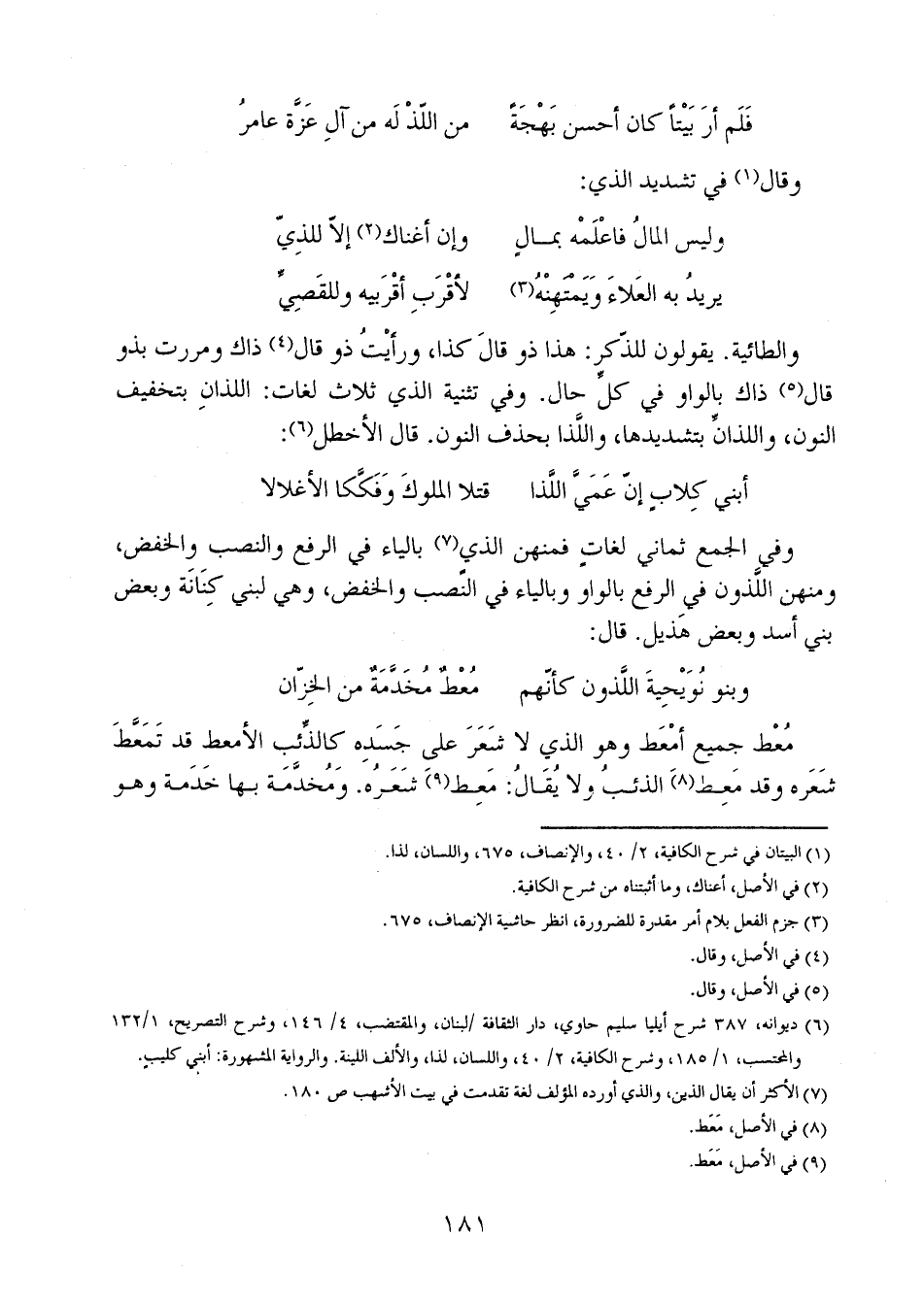 وفي الجمع ثماني لغات فمنهن الذي بالياء في الرفع والنصب والخفض، ومنهن اللذون في الرفع بالواو وبالياء في النصب والخفض، وهي لبنى كنانة وبعض بني أسد وبعض هذيل. قال: