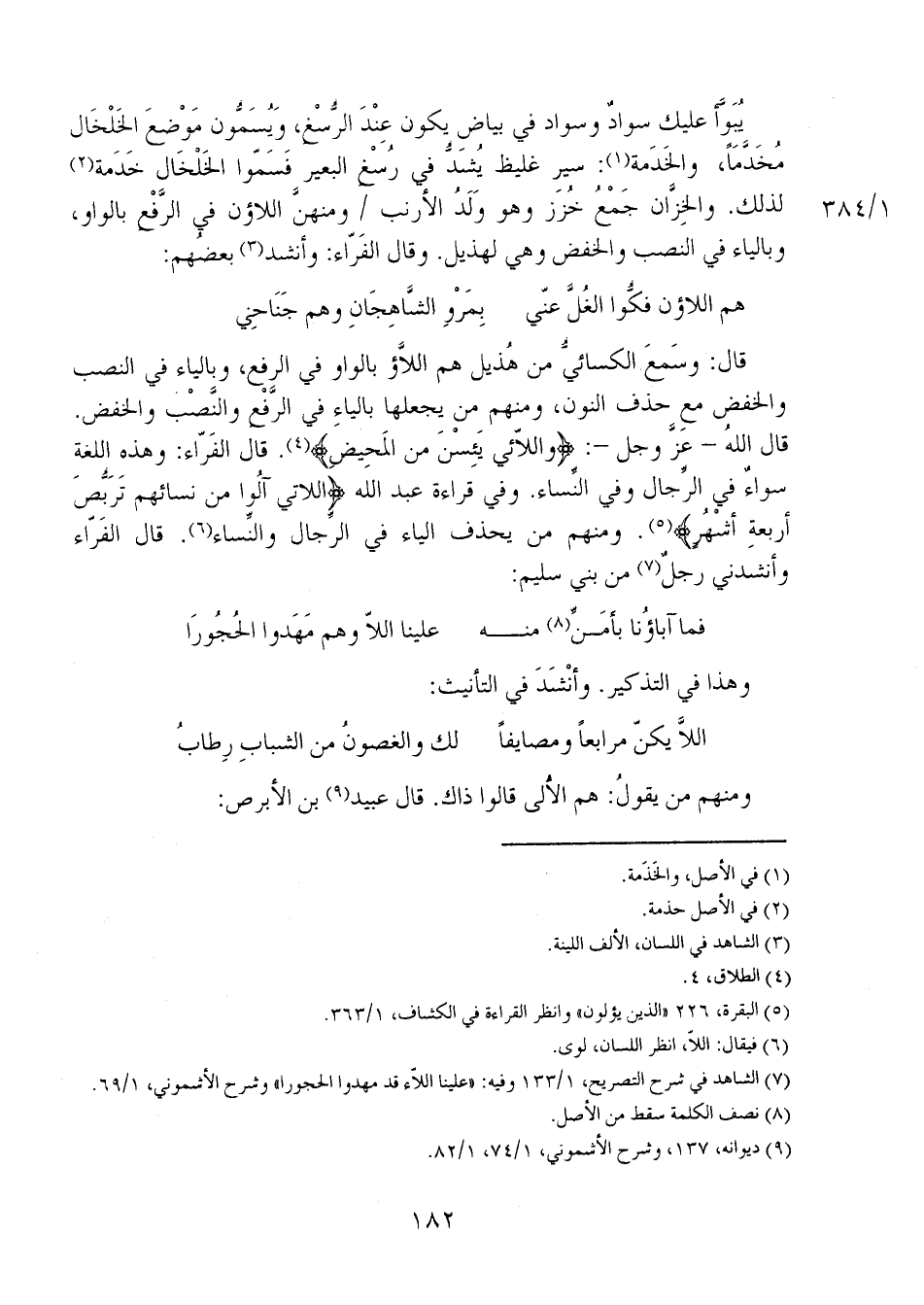 يبوأ عليك سوادٌ وسواد في بياض يكون عند الرسغ، ويُسمون موضع الخلخال مخدماً، والخدمة: سير غليظ يُشدُّ في رسغ البعير فسموا الخلخال خدمة لذلك. والخِزَّان جمع خُزَز وهو ولدُ الأرنب 1/ 384 ومنهن اللاؤن في الرَّفع بالواو، وبالياء في النصب والخفض وهي لهذيل. وقال الفراء: وأنشد بعضهم: