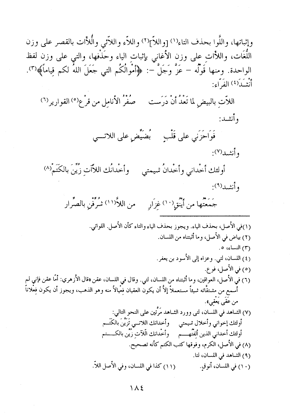 وإثباتها، واللَّوا بحذف التاء [واللا] واللاء واللائي واللأات بالقصر على وزن اللغات، واللأات على وزن الأغاني بإثبات الياء وحذفها، والتي على وزن لفظ الواحدة. ومنها قوله- عز وجل-: {أَمْوَالَكُمْ الَّتِي جَعَلَ اللَّهُ لَكُمْ قِيَاماً}. أنشد الفراء: