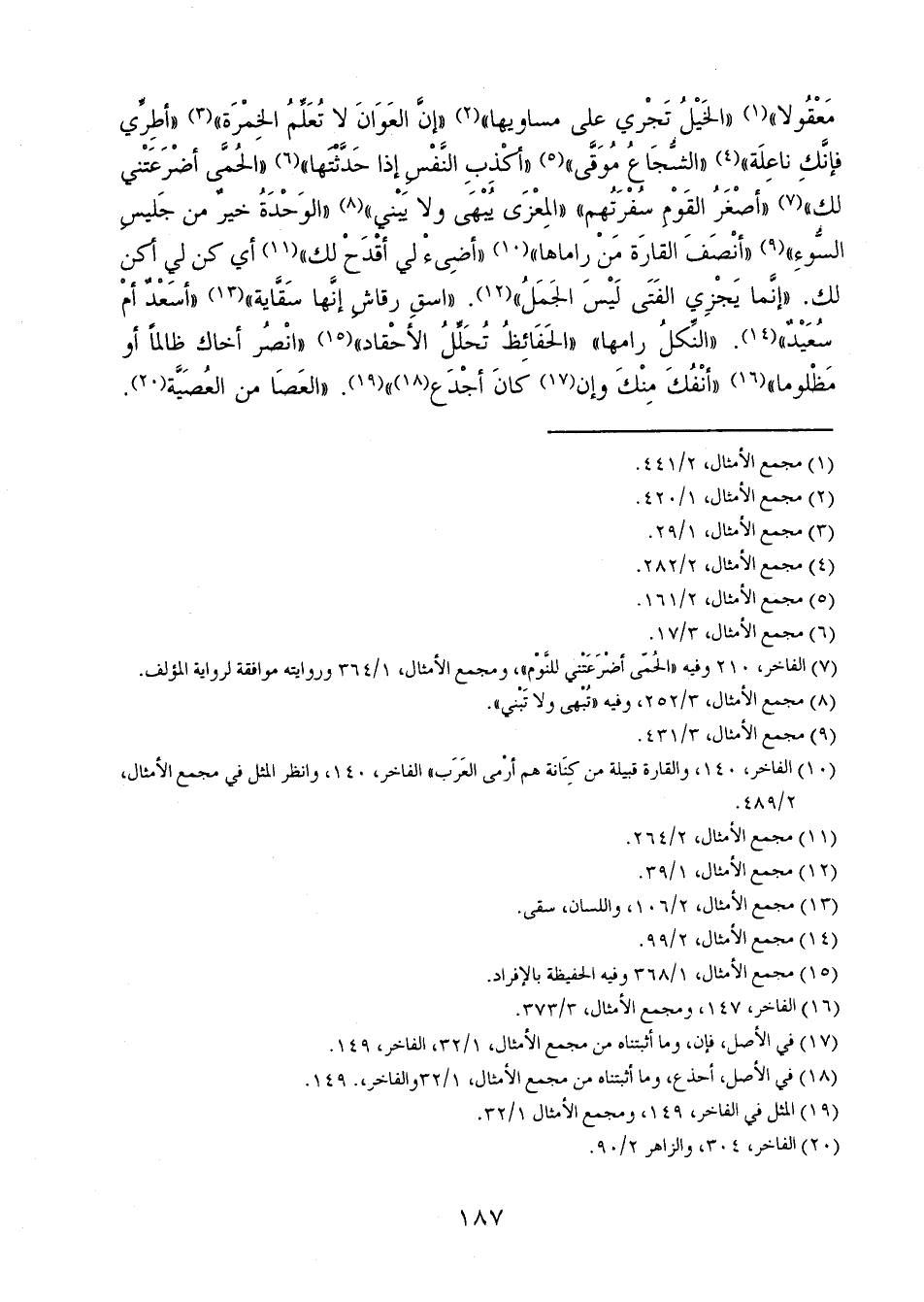 معقولاً" "الخيلُ تجري على مساويها" "إنَّ العَوَانَ لا تُعَلِّمُ الخِمْرَة" "أطِرِّي فإنك ناعِلَة" "الشُّجَاعُ مُوَقَّ" "أكْذبِ النَّفْس إذا حَدُثْتَها" "الحُمِّي أضرَعَتْني لك" "أصغرُ القوم سُفْرَتُهم" "المِعْزَى يُبْهَى ولا يَبْني" "الوحدةُ خيرٌ من جليس السوءِ" "أنْصَفَ القارةَ من راماها" "أضيء لي أقْدَحْ لك" أي كن لي أكن لك. "إنما يجزي الفتى ليس الجمَلُ". "اسقِ رقاشِ إنَّها سَقَّاية" "أسَعْدٌ أمْ سُعَيْدةٌ". "النَّكلُ رامها" "الحفائظُ "تُحَلِّلُ الأحْقاد" "انْصُر أخاك ظالماً أو مظلوماً" "أنْفُكَ مِنْكَ وإن كان أجْدَع". "العَصَا من العُصَيَّة".