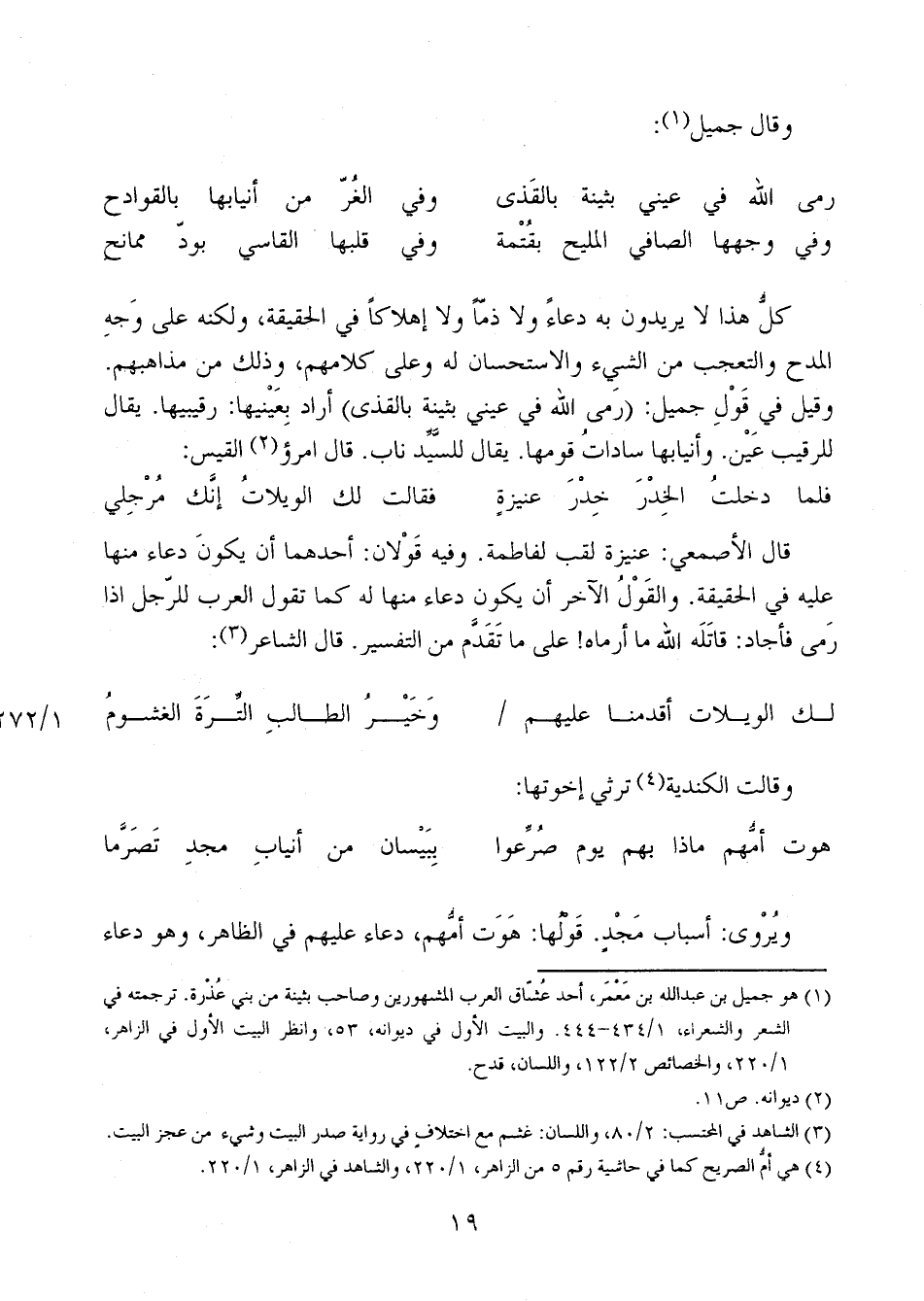كل هذا لا يريدون به دعاء ولا ذماً ولا إهلاكاً في الحقيقة، ولكنه على وجه المدح والتعجب من الشيء والاستحسان له وعلى كلامهم، وذلك من مذاهبهم. وقيل في قول جميل: (رمى الله في عيني بثينة بالقذى) أراد بعينيها: رقيبيها. يقال للرقيب عين. وأنيابها ساداتُ قومها. يقال للسيد ناب. قال امرؤ القيس:
