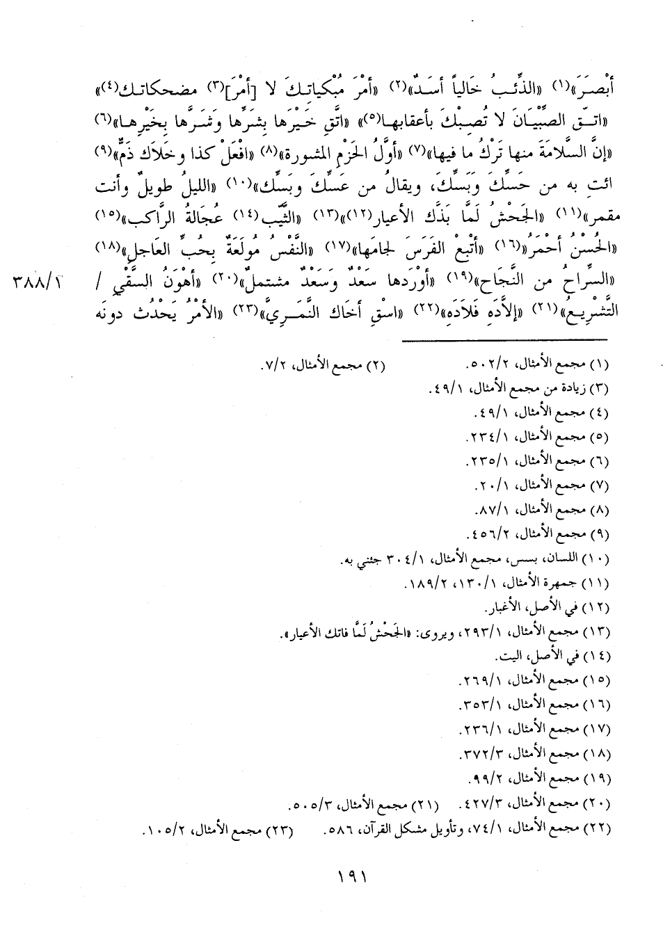 أبصرَ" "الذِّئبُ خالياً أسدٌ" "أمْرَ مُبْكيانِكَ لا [أمْرَ] مضحكاتك" "اتق الصِّبْيَان لا تُصبكَ بأعقابها" "اتِّقِ خيرها بشرها وشرها بخيرها" "إنَّ السَّلامة منها تركُ ما فيها" "أوَّلُ الحزمِ المشورة" "افْعَلْ كذا وخلاك ذمٌّ" ائتِ به من حسِّكَ وبسِّكَ، ويقالُ من عَسَّكَ وبَسِّك" "الليلُ طويلٌ وأنت مقمر" "الجحْشُ لَمَّا بَذَّك الأعيار" "الثَّيْب عُجالةُ الرَّاكب" "الحُسْنُ أحْمَرُ" "أتْبعْ الفَرَسَ لجامَها" "النَّفْسُ مُولَعَةٌ بِحُبِّ العَاجلِ" "السِّراحُ من النَّجَاح" "أوْرَدها سَعْدٌ وَسَعْدٌ مشتملٌ" "أهْوَنُ السَّقْي 1/ 388 التشريعُ" "الاَّدَهِ فَلادَهِ" "اسْقِ أخاك النَّمَرِيَّ" "الأمْرُ يَحْدُث دونَه
