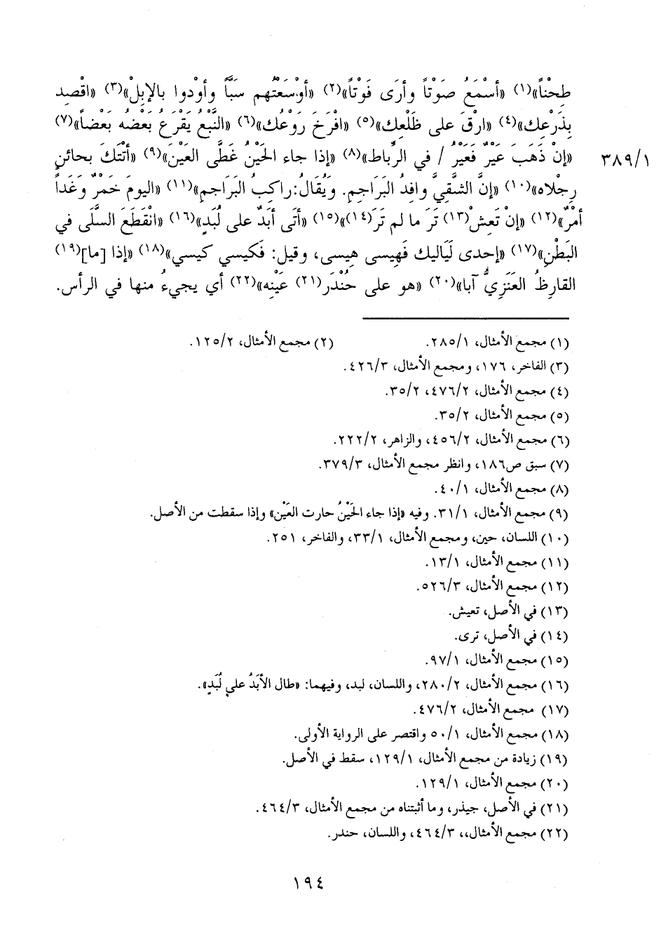 طحْناً" "أسْمَعُ صَوْتاً وأرى فَوْتاً" "أوْسَعْتُهم سَباً وأوْدوا بالإبِلْ" "اقْصِد بِذَرْعِك" "ارْقَ على ظَلْعِك" "افْرَخَ رَوْعُك" "النَّبْعُ يَقْرَعُ بَعْضُه بَعْضاً" "إنْ ذَهَبَ عَيْرٌ فَعَيْرُ 1/ 389 في الرِّباط" "إذا جاء الحَيْنُ غَطَّى العَيْنَ" "أتْتَكَ بحائنٍ رجلاه" "إنَّ الشَّقِيَّ وافِدُ البَرَاجِم. ويُقال: راكبُ البَرَاجمِ" "اليومَ خَمْرٌ وَغَداً أمْرٌ" "إنْ تَعِشْ تَرَ ما لم تَرَ" "أتَى أبَدٌ على لُبَدٍ" "انْقَطَعَ السَّلَى في البَطْنِ" "إحدى لَيَاليك فَهِيسي هيسي، وقيل: فَكيسي كيسي" "إذا [ما] القارِظُ العَنَزِيُّ آبا" "هو على حُنْدَر عَيْنِه" أي يجيءُ منها في الرأس.