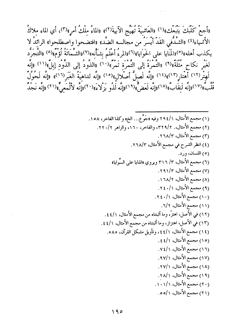 "أجعْ كَلْبَكَ يَتْبَعْك" "العَاشِيَةُ تُهَيِّج الآبيةَ" "الماءُ مِلْكُ أمرٍ"، أي الماء مِلاكُ الأشياء "الشَّدُّفي القَدّ أيْسَرُ من مجالسه الضِّد" "افتضحوا واصطلحوا" الرائدُ لا يكذب أهله" "المَنَايا على الحَوايا" "المرءُ أعْلَمُ بِشَأنِه" "الشَّمَاتَةُ لُؤْمٌ" "التَّجَرُّد لغَيْرِ نكاح مُثْلَةٌ" "التَّمْرَةُ إلى التَّمْرَةِ تَمْرٌ" "الذَّودُ إلى الذُّوْدِ إبِلٌ" "إنَّه لَهتْر أهْتارٍ" "إنَّه لَصِلُّ أصْلالِ" "إنَّه لداهِيَةُ الغَبَرِ" "إنَّه لَحُوَّلٌ قُلَّبٌ" "إنَّه لَنِقَابٌ" "إنَّه لَعَضٌّ" "إنَّه لَذُو بَزْلاءَ" "إنَّه لألْمَعِيٌّ" "إنَّه نَجْدٌ