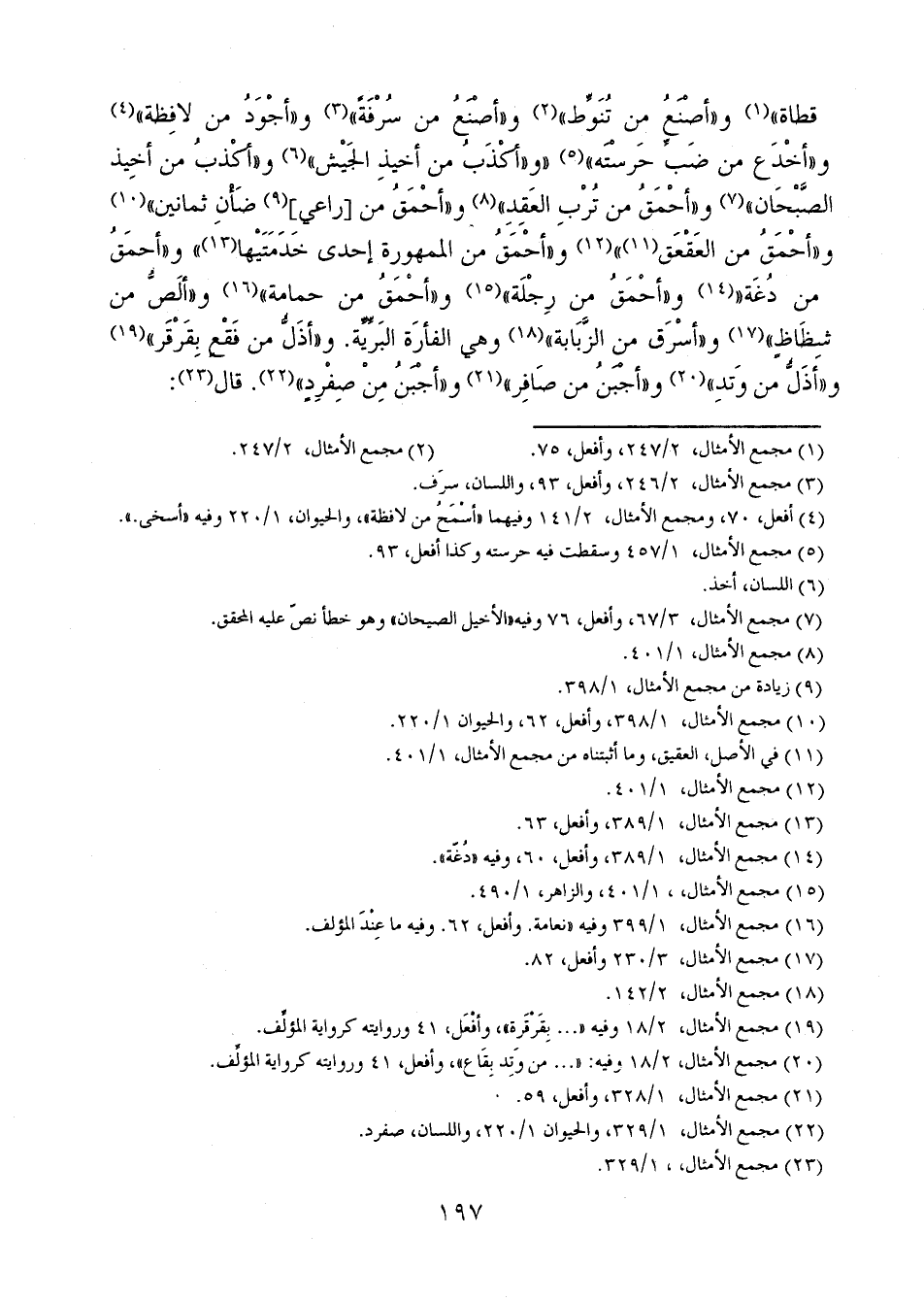 قطاة" و"أصْنَعُ من تُنَوِّط" و"أصْنَعُ من سُرْفَةٌ" و"أجْوَدُ من لافظة" و"أخْدَع من ضَبٌ حَرسْتَه" "أحْمَقُ من [راعي] ضَأنِ ثمانين" و"أحْمَقُ من العَقْعَق" و"أحْمَقُ من الممهورة إحدى خَدَمَتَيْها" و"أحمَقُ من دُغة" و"أحْمَقُ من رِجْلَة" و"أحْمَقُ من حمامة" و"ألَصُّ من شِظَاظٍ" و"أسْرَق من الزَّبَبة" وهي الفأرَة البَرِّيَّة. و"أذَلُّ من فَقْع بِقَرْقَر" و"أذَلُّ من وَتدِ" و"أجْبَنُ من صَافِر" و"أجْبَنُ مِنْ صِفْرِدٍ". قال: