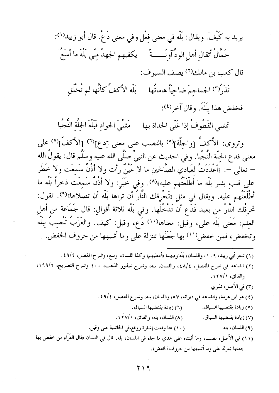 وتروى: الأكف [والجلة] بالنصب على معنى [دع] [الأكف] على معنى فدع الجلة النُّجُبا. وفي الحديث عن النبي صلى الله عليه وسلم قال: يقول الله - تعالى-: "أعددتُ لعبادي الصالحين ما لا عينٌ رأت ولا أذن سمعت ولا خطر على قلب بشر بله ما أطلعتهم عليه". وفي خبر: ولا أذُنٌ سمعت ذخراً بله من أطلعتهم عليه. ويقال في مثل "تحرقك النارُ أن تراها بله أن تصلاها". تقول: تحرقُك النَّارُ من بعيد فدع أن تدخلها. وفي بله ثلاثة أقوال: قال جماعة من أهل العلم: معنى بله على، وقيل: معناها دع، وقيل: كيف. والعربُ تنصبُ ببله وتخفض، فمن خفض بها جعلها بمنزلة على وما أشبهها من حروف الخفض.
