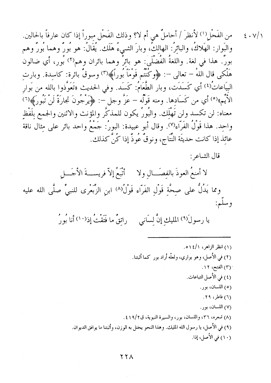 من الفحل لأنظر 1/ 407 أحاملٌ هي أم لا؟ وذلك الفحل مبوراً إذا كان عارفاً بالحالين. والبوار: الهلاكُ، والبائرُ: الهالك، وبار الشيء هلك. يُقال: هو بورٌ وهما بورٌ وهم بورٌ. هذا في لغة، واللغةُ الفضلى: هو بائر وهما بائران وهم بور، أي ضالون هَلْكى قال الله- تعالى-: {وَكُنْتُمْ قَوْماً بُوراً} وسوقٌ بائرة: كاسدة. وبارت البياعات أي كسدت، وبار الطعام: كسد. وفي الحديث "تعوذوا بالله من بوار الأيم" أي من كسادها. ومنه قوله- عز وجل-: {يَرْجُونَ تِجَارَةً لَنْ تَبُورَ} معناه: لن تكسد ولن تهْلِكَ. والبور يكون للمذكر والمؤنث والاثنين والجمع بلفظ واحد. هذا قول الفراء. وقال أبو عبيدة: البورُ: جمعُ واحد بائر على مثال ناقة عائذ إذا كانت حديثة النتاج، ونوقٌ عُودٌ إذا كُنَّ كذلك.