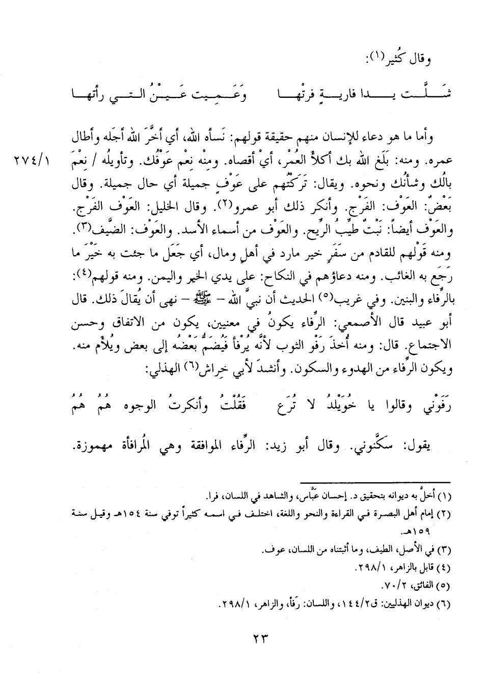 وأما ما هو دعاء للإنسان منهم حقيقة قولهم: نسأه الله، أي أخر الله أجله وأطال عمره. ومنه: بَلَغ الله بك أكلاً العمر، أي أقصاه. ومنه نِعْم عَوْفُك. وتأويلُه 1/ 274 نِعْمَ بالُك وشأنُك ونحوه. ويقال: تركتهم على عوفٍ جميلة أي حال جميلة. وقال بعضُ: العوف: الفرج. وأنكر ذلك أبو عمرو. وقال الخليل: العوف الفرج. والعوف أيضاً: نبتٌ طيبُ الريح. والعوف من أسماء الأسد. والعوف: الضيف. ومنه قولهم للقادم من سفرٍ خير مارد في أهل ومال، أي جعل ما جئت به خير ما رجع به الغائب. ومنه دعاؤهم في النكاح: على يدي الخير واليمن. ومنه قولهم: بالرفاء والبنين. وفي غريب الحديث أن نبي الله - صلى الله عليه وسلم - نهى أن يُقال ذلك. قال أبو عبيد قال الأصمعي: الرفاء يكونُ في معنيين، يكون من الاتفاق وحسن الاجتماع. قال: ومنه أُخذَ رَفْو الثوب لأنه يُرْفأ فيُضَمُّ بعضُه إلى بعض ويُلام منه. ويكون الرفاء من الهدوء والسكون. وأنشد لأبي خراش الهذلي: