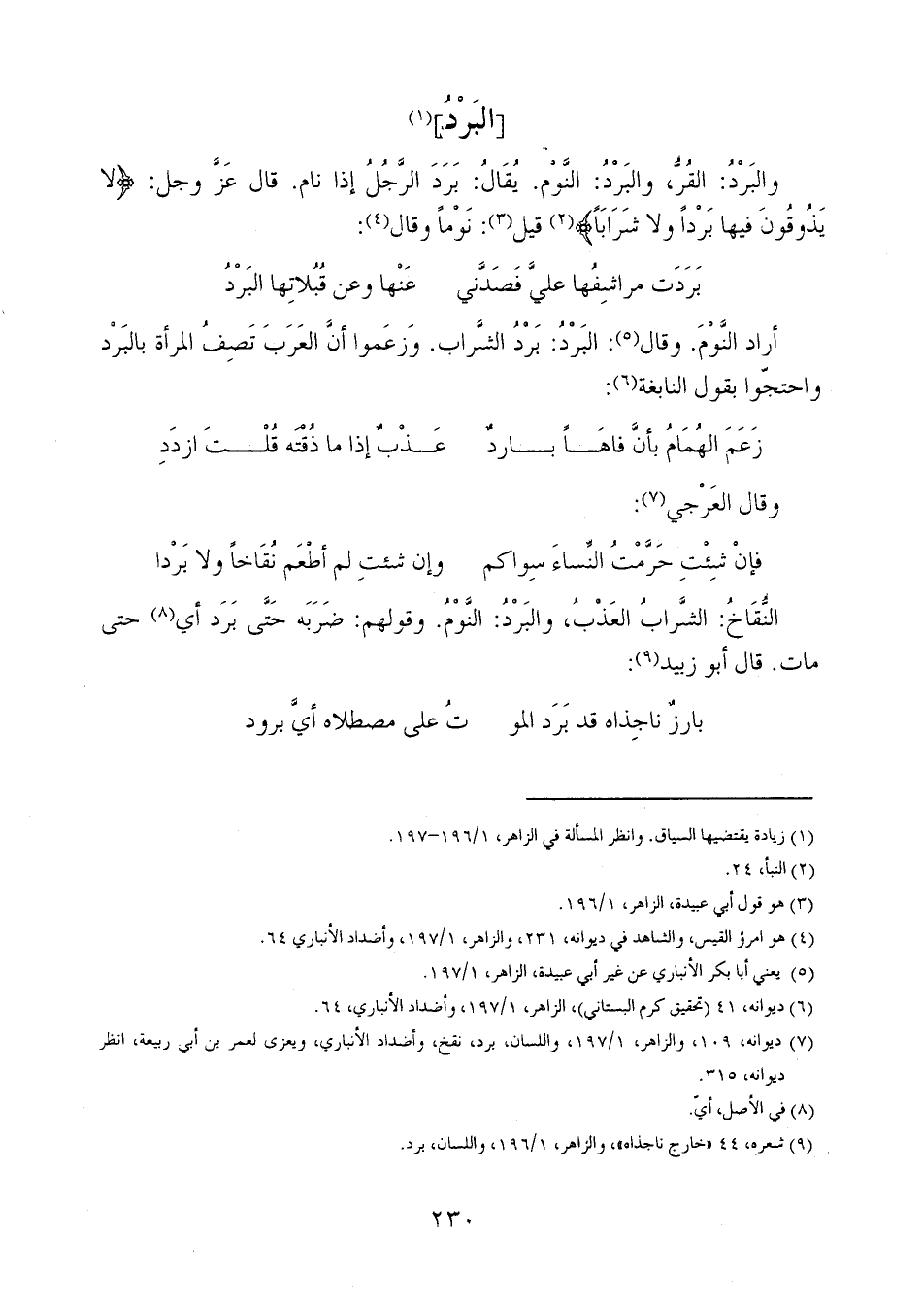 أراد النوم. وقال: البردُ: بردُ الشراب. وزعموا أن العرب تصف المرأة بالبرد واحتجوا بقول النابغة: