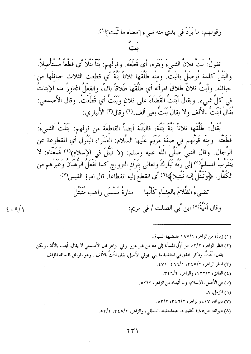 يُقال: طلقَها ثلاثاً بتةً بتلَة، فالبَتْلَة أيضاً القاطعة من قولهم: بَتَلْتُ الشيء: قطعته. ومنه قولهم في صفة مريم عليها السلام: العذراء البتول أي المقطوعة عن الرجال. وقال النبي صلى الله عليه وسلم: (لا تَبَتُّلَ في الإسلام) فمعناه: لا يتقرب المسلم إلى ربه تبارك وتعالى بترك التزويج كما تفعل الرهبان وغيرهم من الكفار. {وَتَبَتَّلْ إِلَيْهِ تَبْتِيلاً} أي انقطع إليه انقطاعاً. قال امرؤ القيس: