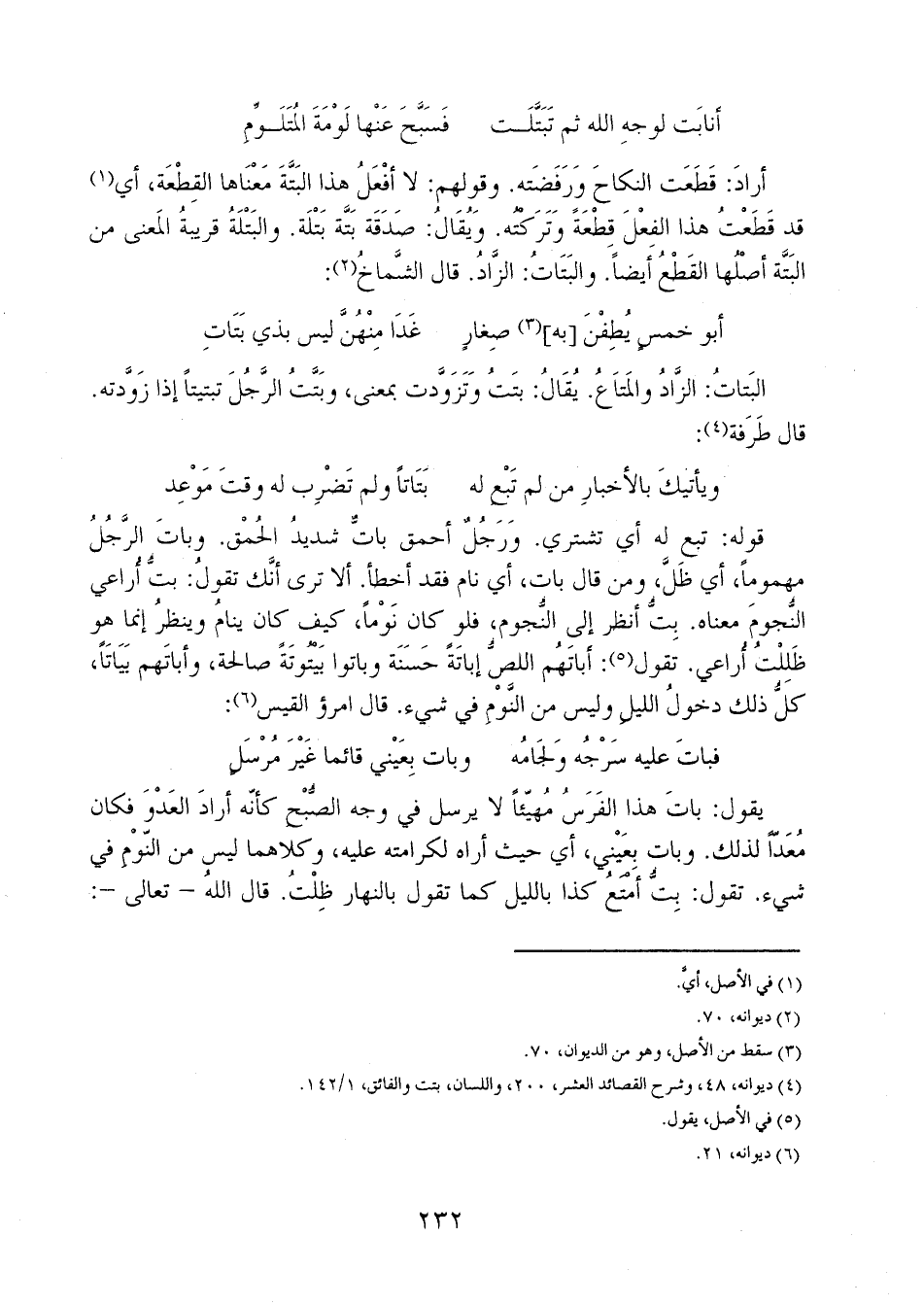 قوله: تبع له أي تشتري. ورجلٌ أحمق بات شديد الحُمق. وبات الرجل مهموماً، أي ظل، ومن قال بات، أي نام فقد أخطأ. ألا ترى أنك تقول: بتُّ أراعي النجوم معناه. بتُّ أنظر إلى النجوم، فلو كان نوماً، كيف كان ينام وينظر إنما هو ظللت أراعي. تقول: أباتهم اللص إباتةً حسنة وباتوا بيتوتةً صالحة، وأياتهم بياتاً، كل ذلك دخول الليل وليس من النوم في شيء. قال امؤر القيس: