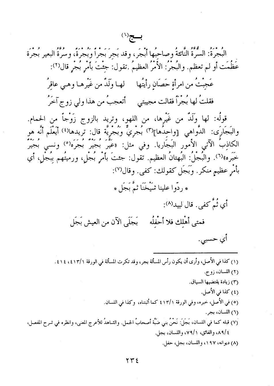 قوله: لها ولدٌ من غيرها، من اللهو، وتريد بالزوج زوجاً من الحمام والبجاري: الدواهي [واحدها] بُجريٍّ وبُجْرَّية قال: تريدها أيعلم أنه هو الكاذب الآتي الأمور البجاريا. وفي مثل: "عَيَّرَ بُجَيْرٌ بَجَرَه ونسي بَجَيْرٌ خبره". والبُجْلُ: البُهتانُ العظيم. تقول: جئت بأمرٍ بُجْلٍ، ورميتُهم بِبُجْلِ، أي بأمرٍ عظيمٍ منكر. وبَجَل كقولك: كفى. وقال: