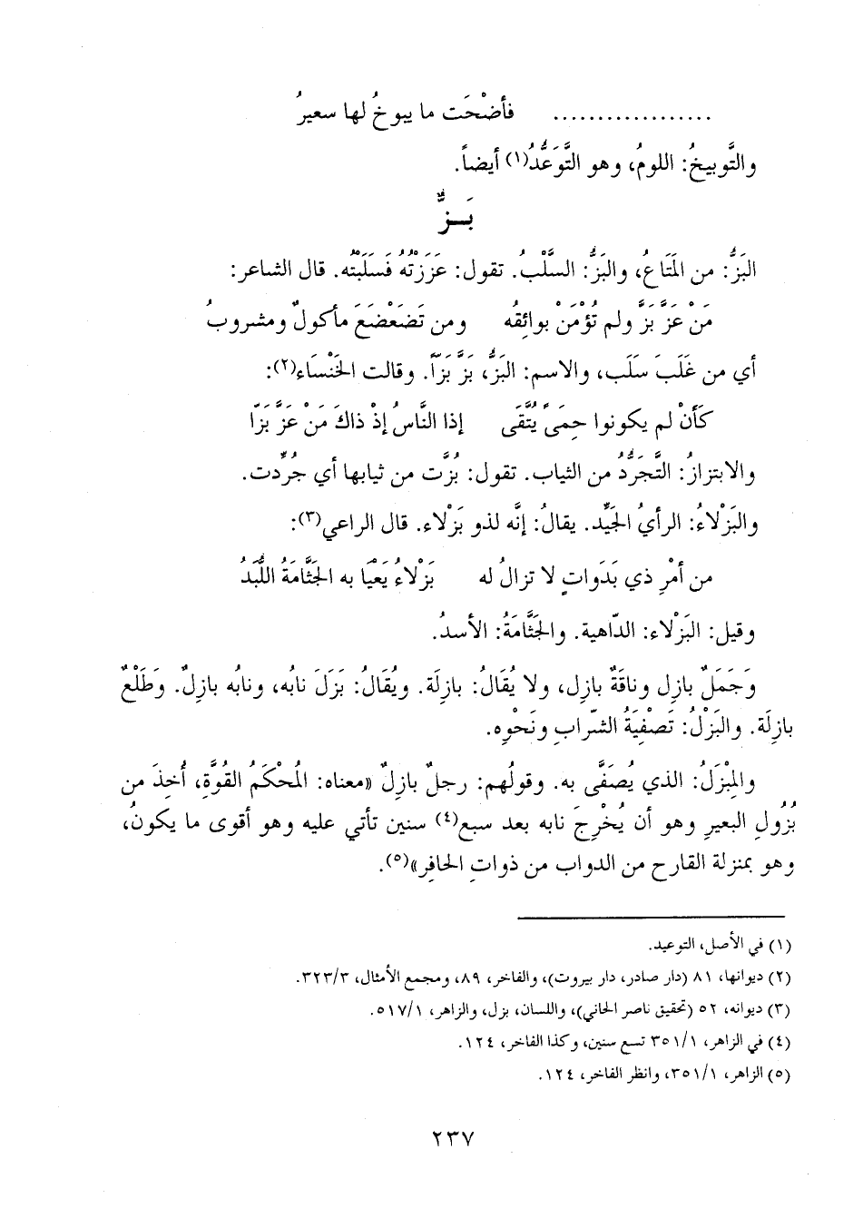 وجملٌ بازل وناقةٌ بازل، ولا يقال: بازلة. ويقال: بزل نابه، ونابه بازلٌ. وطلعٌ بازلة. والبزلُ: تصفية الشراب ونحوه.