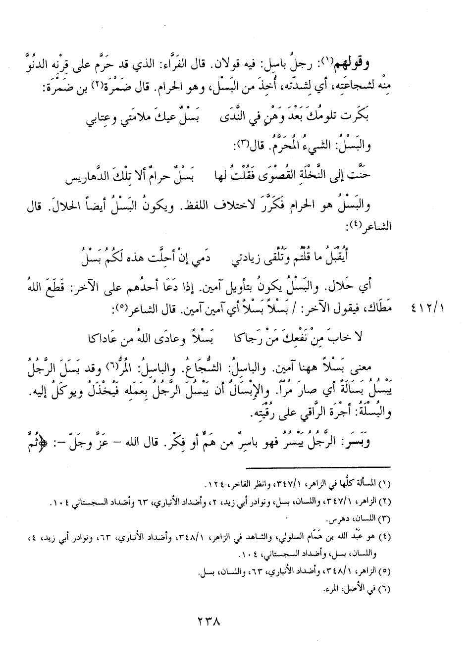 وقولهم: رجلٌ باسل: فيه قولان. قال الفراء: الذي قد حرم على قرنه الدنو منه لشجاعته، أي لشدته، أخذ من البسل، وهو الحرام. قال ضمرة بن ضمرة:
