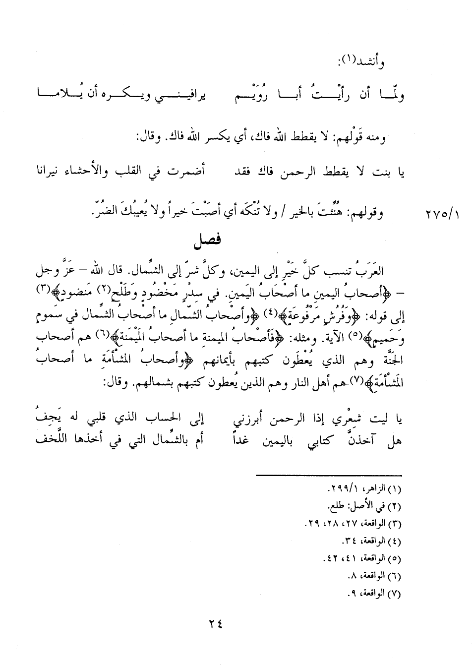 العرب تنسب كل خير إلى اليمين، وكل شر إلى الشمال. قال الله - عز وجل - {أَصْحَابُ الْيَمِينِ مَا أَصْحَابُ الْيَمِينِ (27) فِي سِدْرٍ مَخْضُودٍ (28) وَطَلْحٍ مَنْضُودٍ} إلى قوله: {وَفُرُشٍ مَرْفُوعَةٍ} {وَأَصْحَابُ الشِّمَالِ مَا أَصْحَابُ الشِّمَالِ (41) فِي سَمُومٍ وَحَمِيمٍ} الآية. ومثله: {فَأَصْحَابُ الْمَيْمَنَةِ مَا أَصْحَابُ الْمَيْمَنَةِ} هم أصحاب الجنة وهم الذي يُعطون كتبهم بأيمانهم {وَأَصْحَابُ الْمَشْئَمَةِ مَا أَصْحَابُ الْمَشْئَمَةِ} هم أهل النار وهم الذين يُعطون كتبهم بشمالهم. وقال: