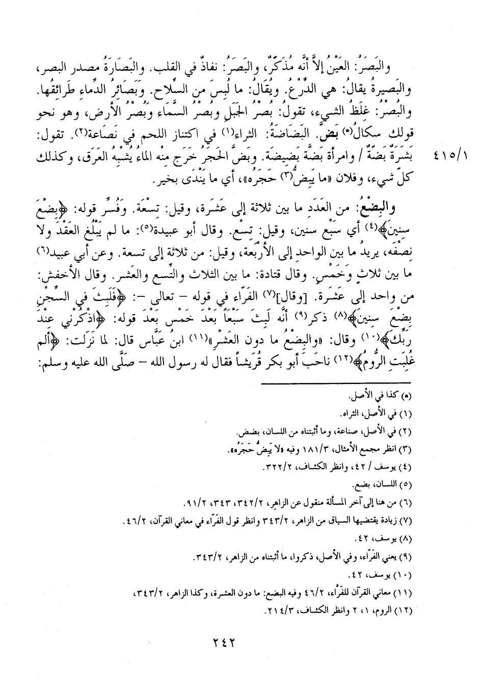 والبضْعُ: من العدد ما بين ثلاثة إلى عشرة، وقيل: تسعة. وفُسر قوله: {بِضْعِ سِنِينَ} أي سبع سنين، وقيل: تسع. وقال أبو عبيدة: ما لم يبلغ العقد ولا نصفه، يريد ما بين الواحد إلى الأربعة، وقيل: من ثلاثة إلى تسعة. وعن أبي عبيد ما بين ثلاث وخمس. وقال قتادة: ما بين الثلاث والتسع والعشر. وقال الأخفش: من واحد إلى عشرة. [وقال] الفراء في قوله-تعالى-: {فَلَبِثَ فِي السِّجْنِ بِضْعَ سِنِينَ} ذكر أنه لبث سبعاً بعد خمس بعد قوله: {اذْكُرْنِي عِنْدَ رَبِّكَ} وقال: "والبضعُ ما دون العشر" ابن عباس قال: لما نزلت: {الم * غُلِبَتْ الرُّومُ} ناحب أبو بكر قريشاً فقال له رسول الله - صلى الله عليه وسلم: