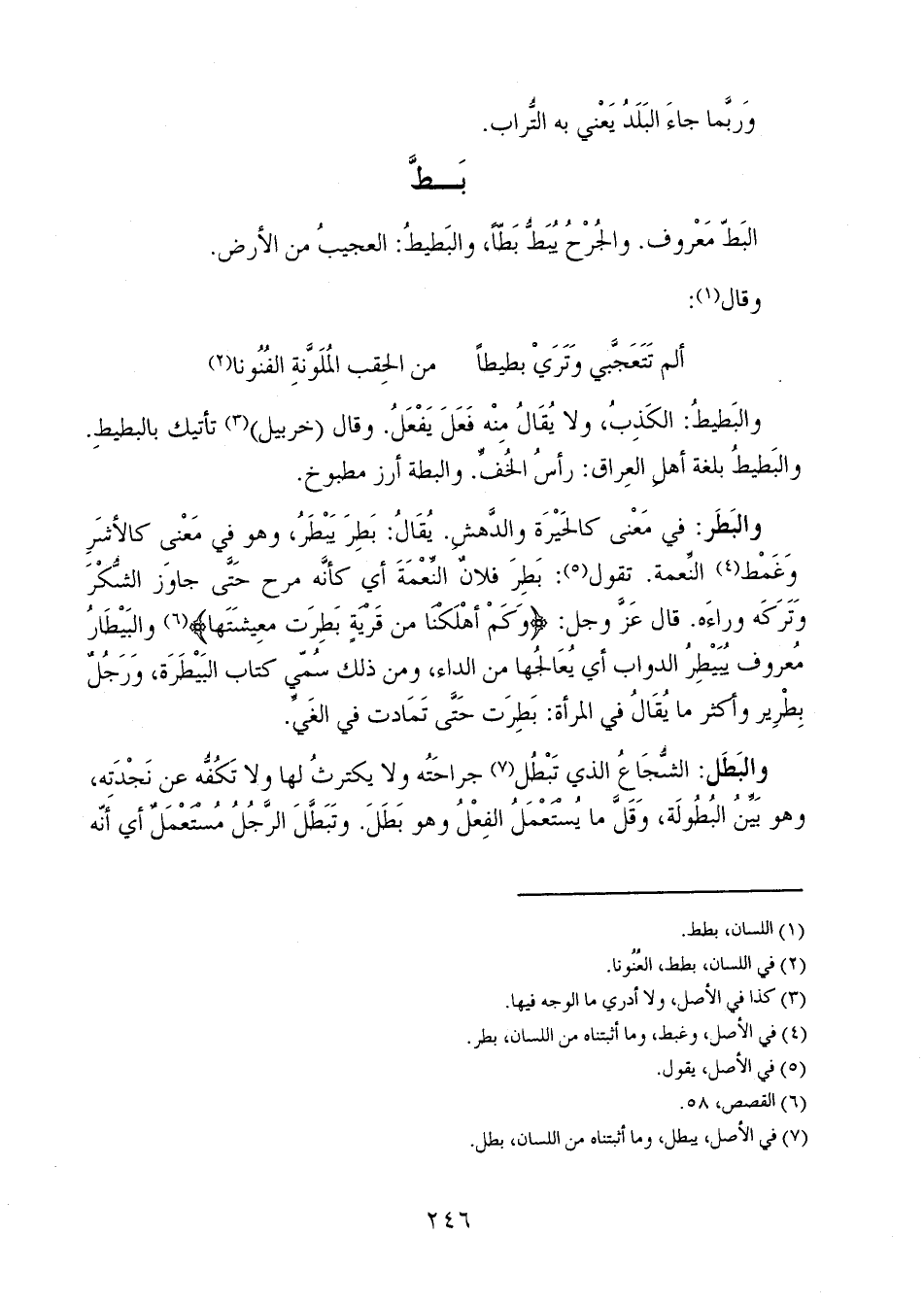 والبَطَر: في معنى كالحيرة والدهش. يقال: بطر يَبْطَرُ، وهو في معنى كالأشر وغمط النعمة. تقول: بطر فلانٌ النعمة أي كأنه مرح حتى جاوز الشكر وتركه وراءه. قال عز وجل: {وَكَمْ أَهْلَكْنَا مِنْ قَرْيَةٍ بَطِرَتْ مَعِيشَتَهَا} والبيطارُ معروف يُبَيْطِرُ الدواب أي يعالجها من الداء، ومن ذلك سُمي كتاب البيطرة، ورجلٌ بطرير وأكثر ما يقال في المرأة: بطرت حتى تمادت ف يالغي.