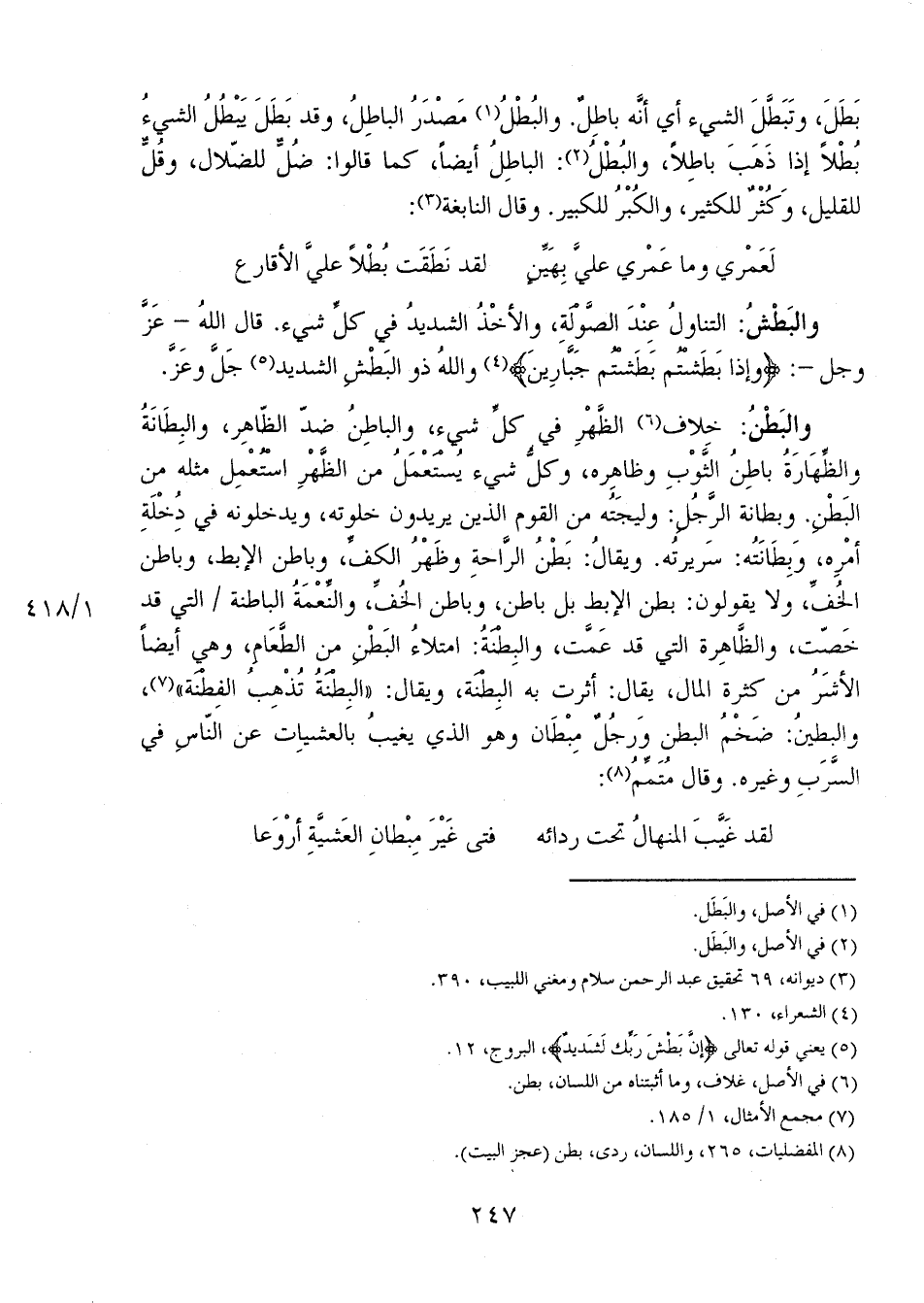 والبطنُ: خلاف الظهر في كل شيء، والباطن ضد الظاهر، والبطانةُ والظهارة باطن الثوب وظاهره، وكل شيء يستعمل من الظهر استعمل مثله من البطن، وبطانة الرجل: وليجته من القوم الذين يريدون خلوته، ويدخلونه في دخلة أمره، وبطانته: سريرته. ويقال: بطنُ الراحة وظهرُ الكف، وباطن الإبط، وباطن الخف، ولا يقولون: بطن الإبط بل باطن، وباطن الخف، والنعمةُ الباطنة 1/ 418 التي قد خصت، والظاهرة التي قد عمت، والبطنةُ: امتلاءُ البطن من الطعام، وهي أيضاً الأشر من كثرة المال، يقال: أثرت به البطنة، ويقال: "البطنةُ تُذهبُ الفطنة"، والبطين: ضخم البطن ورجلٌ مبطان وهو الذي يغيب بالعشيات عن الناس في السَّرَبِ وغيره. وقال متممُ: