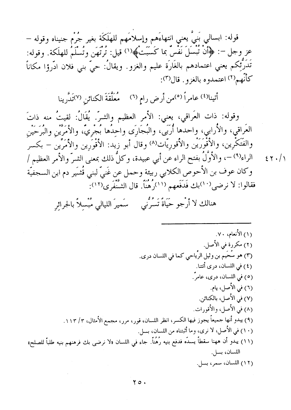 وقوله: ذات العراقي، يعني: الأمر العظيم والشر. يُقال: لقيت منه ذات العراقي، والأرابي، واحدها أُربي، والبُجاري واحدها بُجريٌ، والأمرين والبرجين والفتكرين، والأقورين والأقوريات، وقال أبو زيد: الأقورين والأمرين - بكسر الراء-، والأول بفتح الراء عن أبي عبيدة، وكل ذلك بمعنى الشر والأمر العظيم 1/ 420 وكان عوف بن الأحوص الكلابي ربيئة وحمل عن غنى لبني قُشير دم ابن السجفية فقالوا: لا نرضى بك فدفعهم رهناً. قال الشنفري: