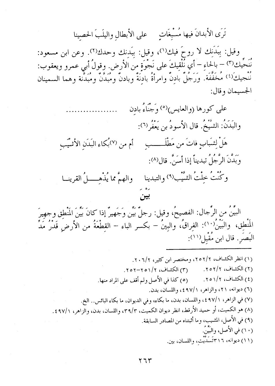 البيِّنُ من الرجال: الفصيحُ، وقيل: رجلٌ بين وجهيرٌ إذا كان بين المنطق وجهيرَ المنطق، والبينُ: الفراق، والبينُ - بكسر الباء - القطعة من الأرض قدر مدٌ البصر. قال ابن مقبل: