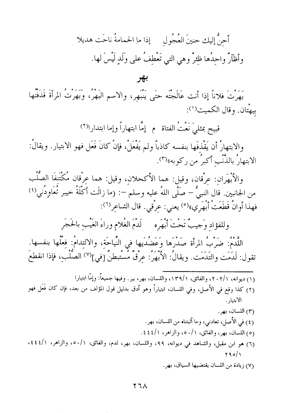 والأبْهَرانِ: عرْقان، وقيل: هما الأكحلان، وقيل: هما عرقان مكتنفا الصلب من الجانبين. قال النبي - صلى الله عليه وسلم-: (ما زالت أكلةُ خيبر تعاودني فهذا أوان قطعت أبهري" يعني: عرقي. قال الشاعر: