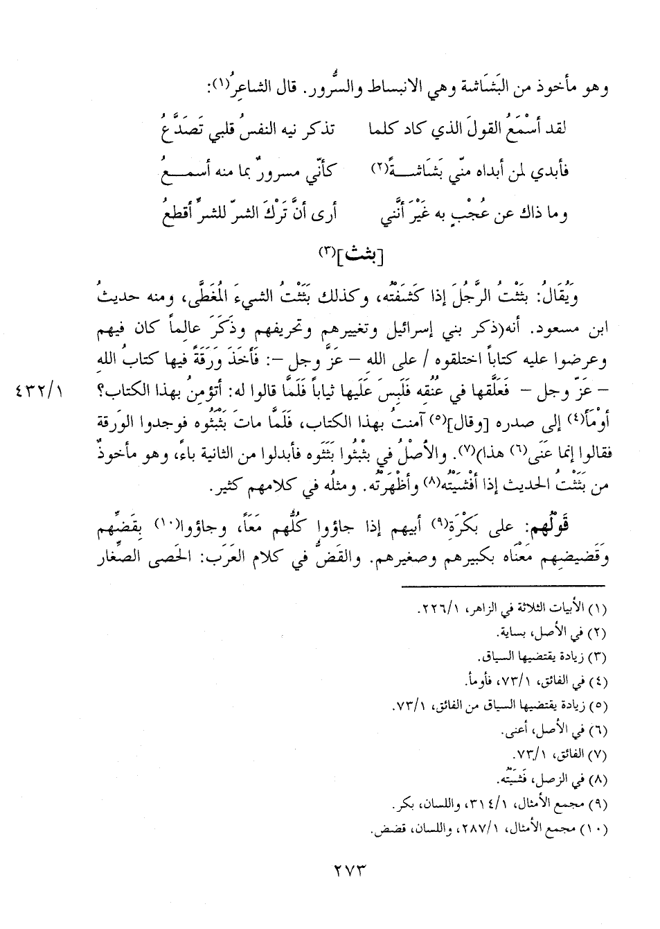 ويُقال: بثَثْتُ الرَّجُلَ إذا كشفْتُه، وكذلك بَثَثْتُ الشيء المُغطى، ومنه حديثُ ابن مسعود. أنه (ذكر بني إسرائيل وتغييرهم وتحريفهم وذكر عالماً كان فيهم وعرضوا عليه كتاباً اختلقوه 1/ 432 على الله- عز وجل-: فأخذَ ورقةً فيها كتابُ الله - عز وجل- فعلقها في عُنُقِه فلبس عليها ثياباً فلمَّا قالوا له: أتؤمنُ بهذا الكتاب؟ أومأ إلى صدره [وقال] آمنتُ بهذا الكتاب، فَلَمَّا مات بثبثوه فوجدوا الورقة فقالوا إنما عني هذا). والأصلُ في بثبثوا بثثوه فأبدلوا من الثانية باءً، وهو مأخوذٌ من بثثتُ الحديث إذا أفْشَيْتُه وأظهرته. ومثله في كلامهم كثير.