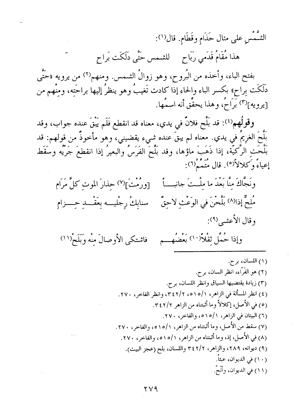 وقولهم: قد بَلَّح فلانٌ في يدي، معناه قد انقطع فلم يبْقَ عنده جواب، وقد بلَّحَ الغريمُ في يدي. معناه لم يبق عنده شيء يقضيني، وهو مأخوذٌ من قولهم: قد بَلَّحَتِ الرَّكيّة، إذا ذهب ماؤها، وقد بلح الفرسُ والبعيرُ إذا انقطع جريه وسقط إعياء وكلالاً. قال متمم: