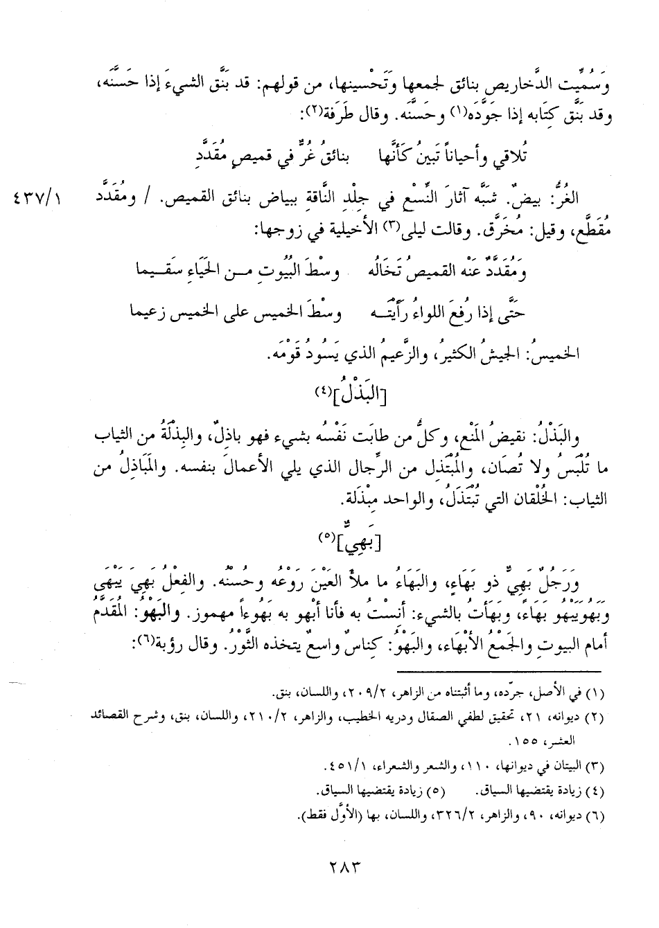 الغُرُّ: بيضٌ. شبه آثار النسع في جلد الناقة ببياض بنائق القميص. 1/ 437 ومُقدَّد مقطع، وقيل: مخرق. وقالت ليلى الأخيلية في زوجها: