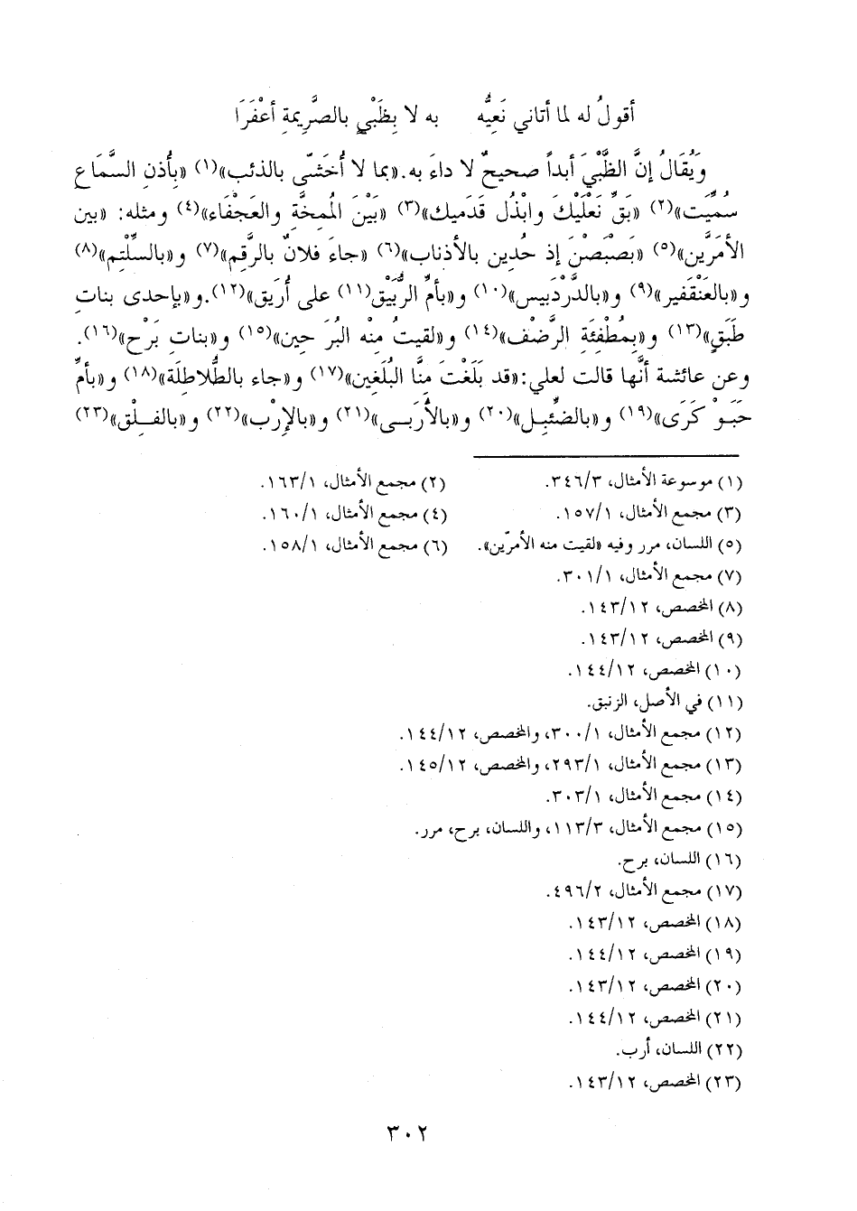 ويقال إن الظبي أبداً صحيحٌ لا داء به. "بما لا أخشى بالذئب" "بأذن السماع سُميت" "بَقِّ نعليك وابْذُل قدميك" "بيْنَ المْمِخَّةِ والعَجْفَاء" ومثله:"بين الأمرين" "بصْبَصْنَ إذ حُدين بالأذناب" "جاء فلانٌ بالرقم" و"بالسِّلْتِم" و"بالعَنْقَفير" و"بالدَّرْدَبيس" و"بأمِّ الرُّبَيْق على أُرَيق". "وبإحدى بنات طبقٍ" و"بمطفئةِ الرَّضْف" و"لقيتُ منْه البُرَ حِين" و"بناتِ بَرْح". وعن عائشة أنَّها قالت لعلي: "قد بَلَغْتَ منَّا البُلَغِين" و"جاء بالطُّلاطِلَة" و"بأمِّ حَبَوْ كَرَى" و"بالضَّئبِل" و"بالأرَبى" و"بالإرْب" و"بالفِلْق"