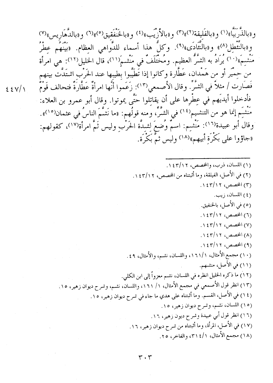 و"بالذَّرَبَيًّا" و"بالفَليقة" و"بالأزْيَب" و"بالخنْفَقيق" و"بالدَّهاريس" و"بالنئطل" و"بالنئادي". وكل هذا أسماء للدواهي العظام. "بينهُم عِطْرُ منشم" يُراد به الشر العظيم. ومختلفٌ في منشم، قال الخليل: هي امرأة من حمير أو من همدان، عطارة وكانوا إذا تطيبوا بطيبها ند الحرب اشتدت بينهم فصارت 1/ 447 مثلاً في الشر. وقال الأصمعي: زعموا أنها امرأةٌ عطارةٌ فتحالف قومٌ فأدخلوا أيديهم في عطرها على أن يقاتلوا حتى يموتوا. وقال أبو عمرو بن العلاء: مَنْشِمَ إنما هو من التنشيم في الشرِّ، ومنه قولهم: "ما نَشَّمَ الناسُ في عثمان". وقال أبو عبيدة: مَنْشِم: اسمٌ وُضع لشدة الحرب وليس ثمَّ امرأة، كقولهم: "جاؤوا على بَكْرَةِ أبيهم" وليس ثمَّ بكرة.