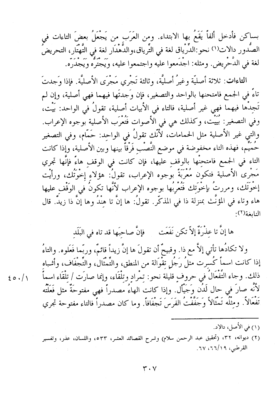 التاءات: ثلاثة أصلية وغير أصلية، وثالثة تجري مجرى الأصلية. فإذا وجدت تاء في الجمع فامتحنها بالواحد والتصغير، فإن وجدتها فيهما فهي أصلية، وإن لم تجدها فيهما فهي غير أصلية، فالتاء في الأبيات أصلية، تقول في الواحد: بيت، وفي التصغير: يُبَيْت، وكذلك هي في الأصوات فتعرب الأصلية بوجوه الإعراب. والتي غير الأصلية مثل الحمامات، لأنك تقول في الواحد: حمام، وفي التصغير حميم، فهذه التاء مخفوضة في موضع النصب فرقاً بينها وبين الأصلية، وإذا كانت التاء في الجمع فامتحنها بالوقف عليها، فإن كانت في الوقف هاء فإنها تجري مجرى الأصلية فتكون معربةٌ بوجوه الإعراب، تقول: هؤلاء إخوتك، ورأيت إخوتك، ومررت بإخوتك فتعربها بوجوه الإعراب لأنها تكون في الوقف عليها هاء وتاء ف يالمؤنث بمنزلة ذا في المذكر. تقول: ها إن تا هندُ وها إن ذا زيدٌ. قال النابغة: