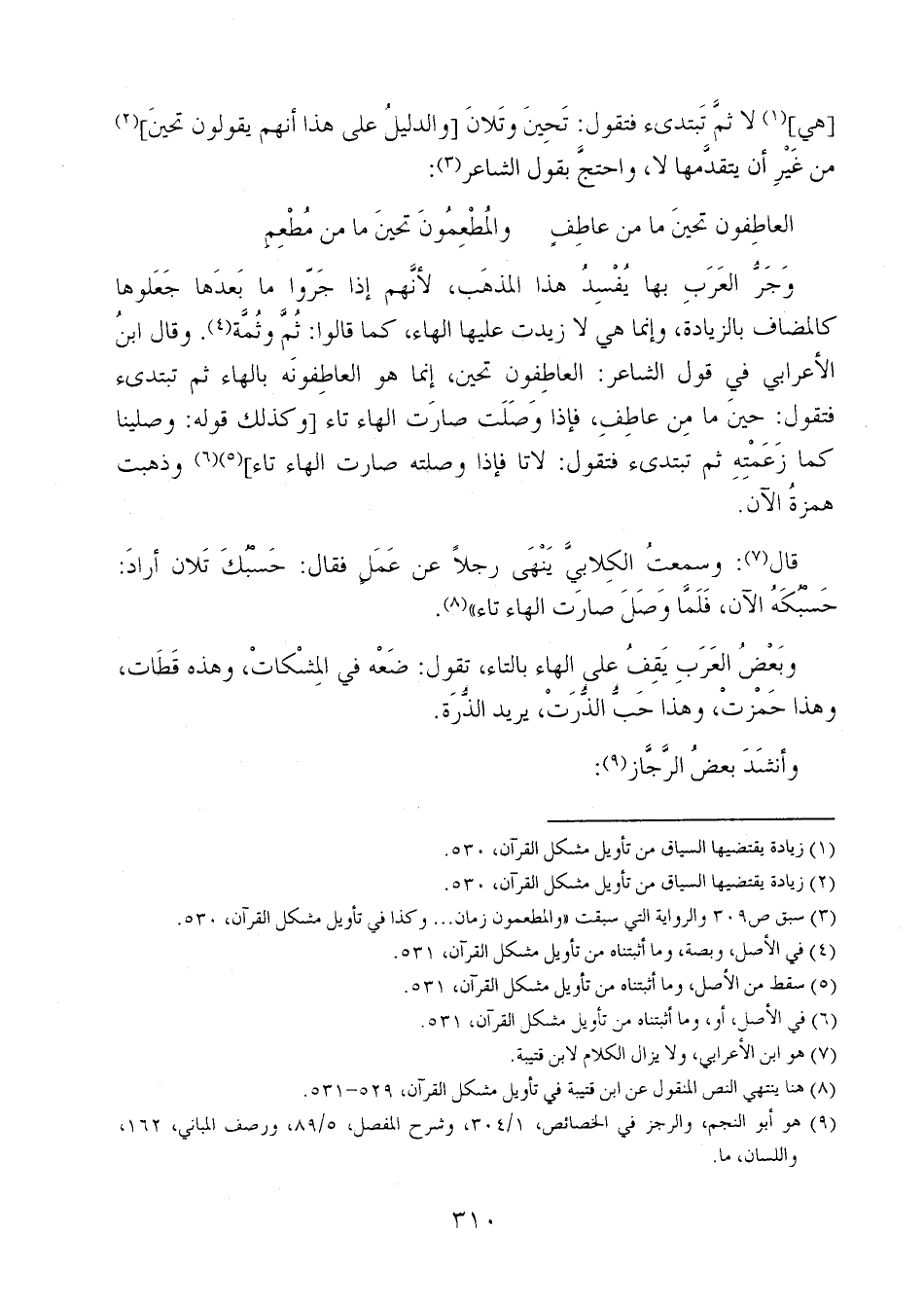 وجر العرب بها يفسد هذا المذهب، لأنهم إذا جروا ما بعدها جعلوها كالمضاف بالزيادة، وإنما هي لا زيدت عليها الهاء، كما قالوا: ثم وثمة. وقال ابن الأعرابي في قول الشاعر: العاطفون تحين، إنما هو العاطفونه بالهاء ثم نبتديء فتقول: حين ما من عاطف، فإذا وصلت صارت الهاء تاء [وكذلك قوله: وصلينا كما زعمته ثم تبتديء فتقول: لاتا فإذا وصلته صارت الهاء تاء] وذهبت همزة الآن.