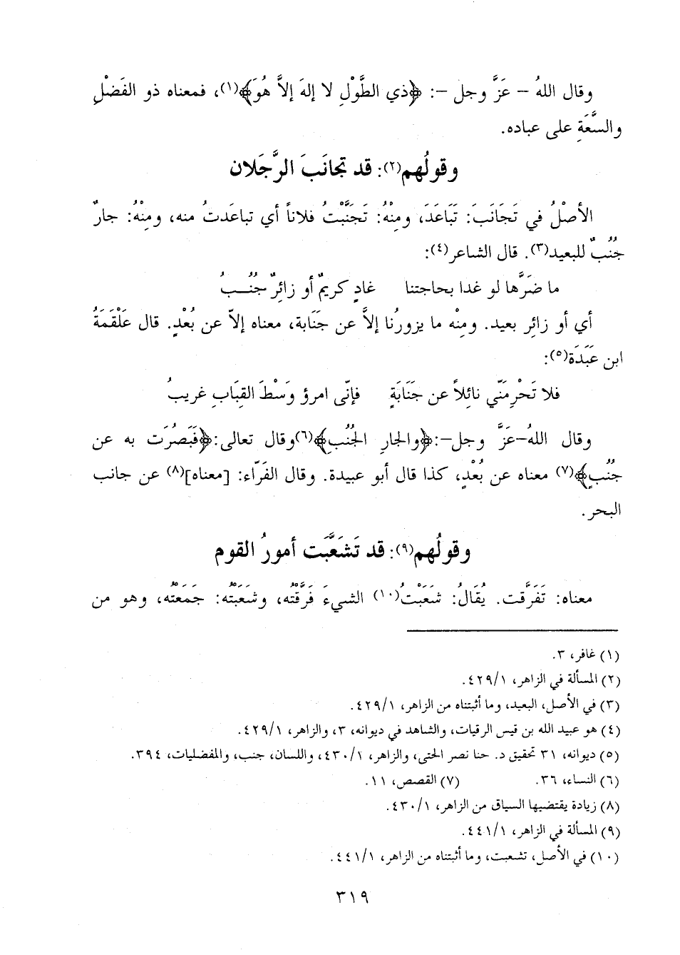 وقال الله - عز وجل-: {وَالْجَارِ الْجُنُبِ} وقال تعالى: {فَبَصُرَتْ بِهِ عَنْ جُنُبٍ} معناه عن بُعدٍ، كذا قال أبو عبيدة. وقال الفراء: [معناه] عن جانب البحر.