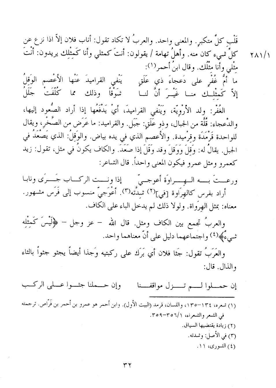 والعربُ تجمع بين الكاف ومثل. قال الله - عز وجل- {لَيْسَ كَمِثْلِهِ شَيْءٌ} واجتماعهما دليل على أن معناهما واحد.