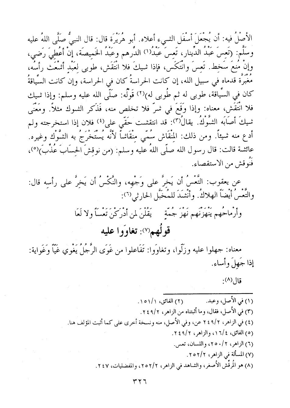 الأصل فيه: أن يُجعل أسفل الشيء أعلاه. أبو هريرة قال: قال النبي صلى الله عليه وسلم: (تعس عبد الدينار، تعس عبد الدرهم وعبد الخميصة، إن أعُطيَ رضي، وإن مُنع سخط، تعس وانتكس، فإذا شيك فلا انتفش، طوبى لعبد أشعث رأسه، مغبرة قدماه في سبيل الله، إن كانت الحراسة كان في الحراسة، وإن كانت السياقة كان في السياقة، طوبى له ثم طوبى له) قوله: صلى الله عليه وسلم: وإذا شيك فلا انتقش، معناه: وإذا وقع في شر فلا تخلص منه، فذكر الشوك مثلاً. ومعنى شيك أصابه الشوكُ. يقال: قد انتقشت حقي على فلان إذا استخرجته ولم أدع منه شيئاً. ومن ذلك: المِنْقَاش سُمي منقاشاً لأنه يُستَخْرَجُ به الشوك وغيره. عائشة قالت: قال رسول الله صلى الله عليه وسلم: (من نوقش الحساب عُذِّبَ)، فنوقش من الاستقصاء.