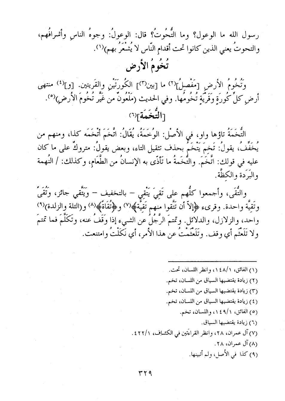 وزتخومُ الأرض [مَفْصِلُ] ما [بين] الكورتين والقريتين. [و] منتهى أرض كل كورة وقريةٍ تخومها. وفي الحديث (ملعونٌ من غير تخوم الأرض).