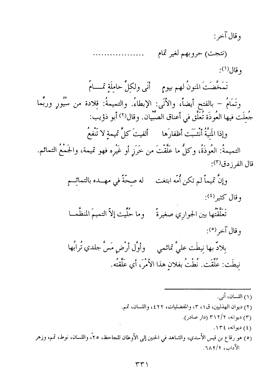 وتمامُ - بالفتح أيضاً، والأنى: الإبطاء. والتميميةُ: قلادة من سيورٍ وربما جُعِلَت فيها العُوذة تُعلق في أعناق الصبيان. وقال أبو ذؤيب: