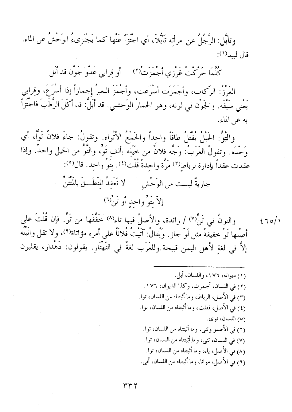 والنون في تَنٍّ 1/ 465 زائدة، والأصلُ فيها تاء خففها من تو. فإن قلت على أصلها تو خفيفة مثل لو جاز. ويقال: آتيتُ فلاناً على أمره مؤاتاة، ولا تقل واتيته إلا في لغة لأهل اليمن قبيحة. وللعرب لغةٌ في التهتار. يقولون: دهدار، يقلبون