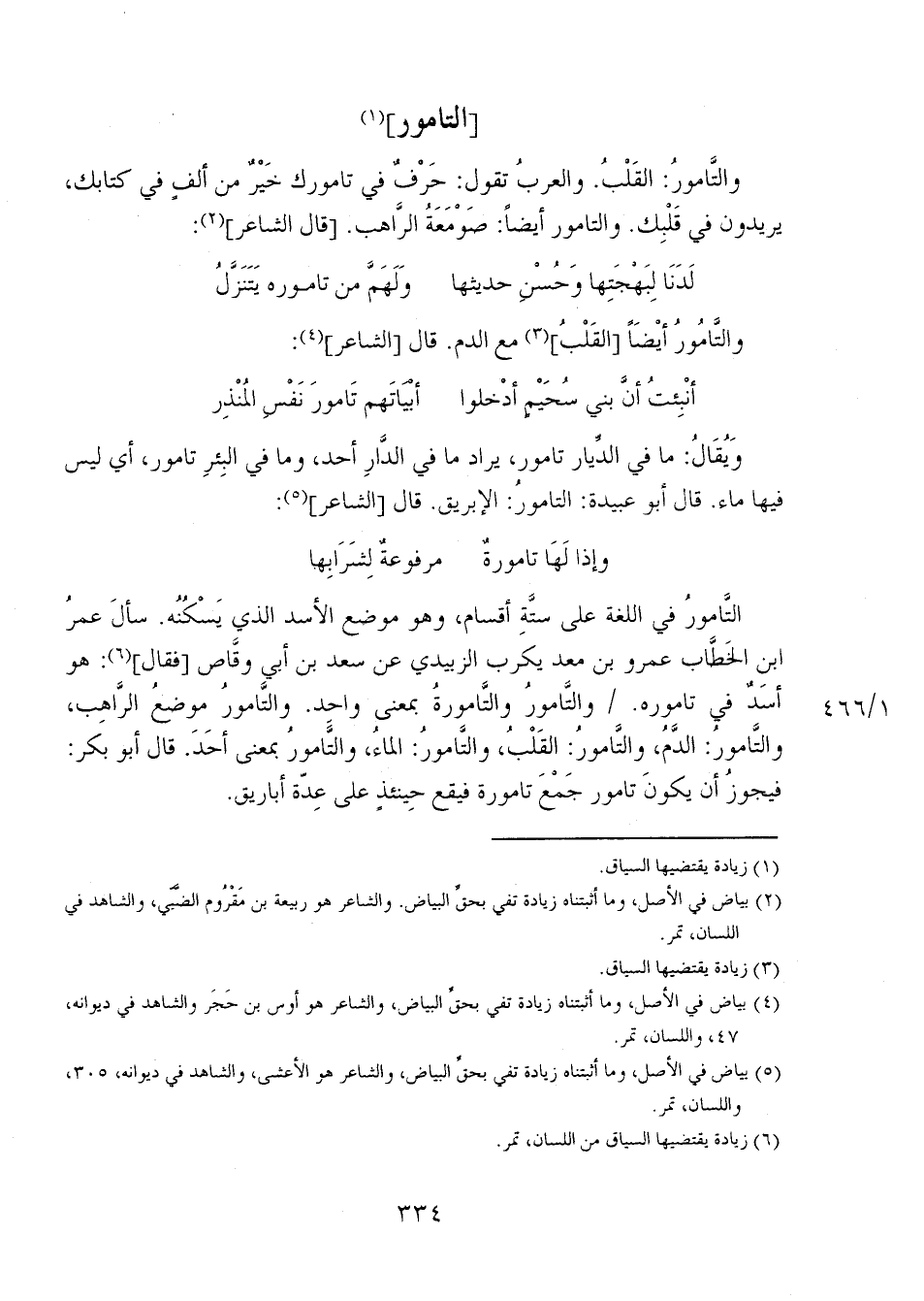التاموُ في اللغة على ستة أقسام، وهو موضع الأسد الذي يسكنه. سأل عمر ابن الخطاب عمرو بن معد يكرب الزبيدي عن سعد بن أبي وقاص [فقال]: هو أسدٌ في تاموره. 1/ 466 والتامورُ والتامورةُ بمعنى واحد. والتامورُ موضع الراهب، والتامورُ: الدَّمُ، والتامورُ: القلبُ، والتامورُ: الماء، والتامورُ بمعنى أحد. قال أبو بكر: فيجوز أن يكون تامور جمع تامورة فيقع حينئذ على عدة أباريق.