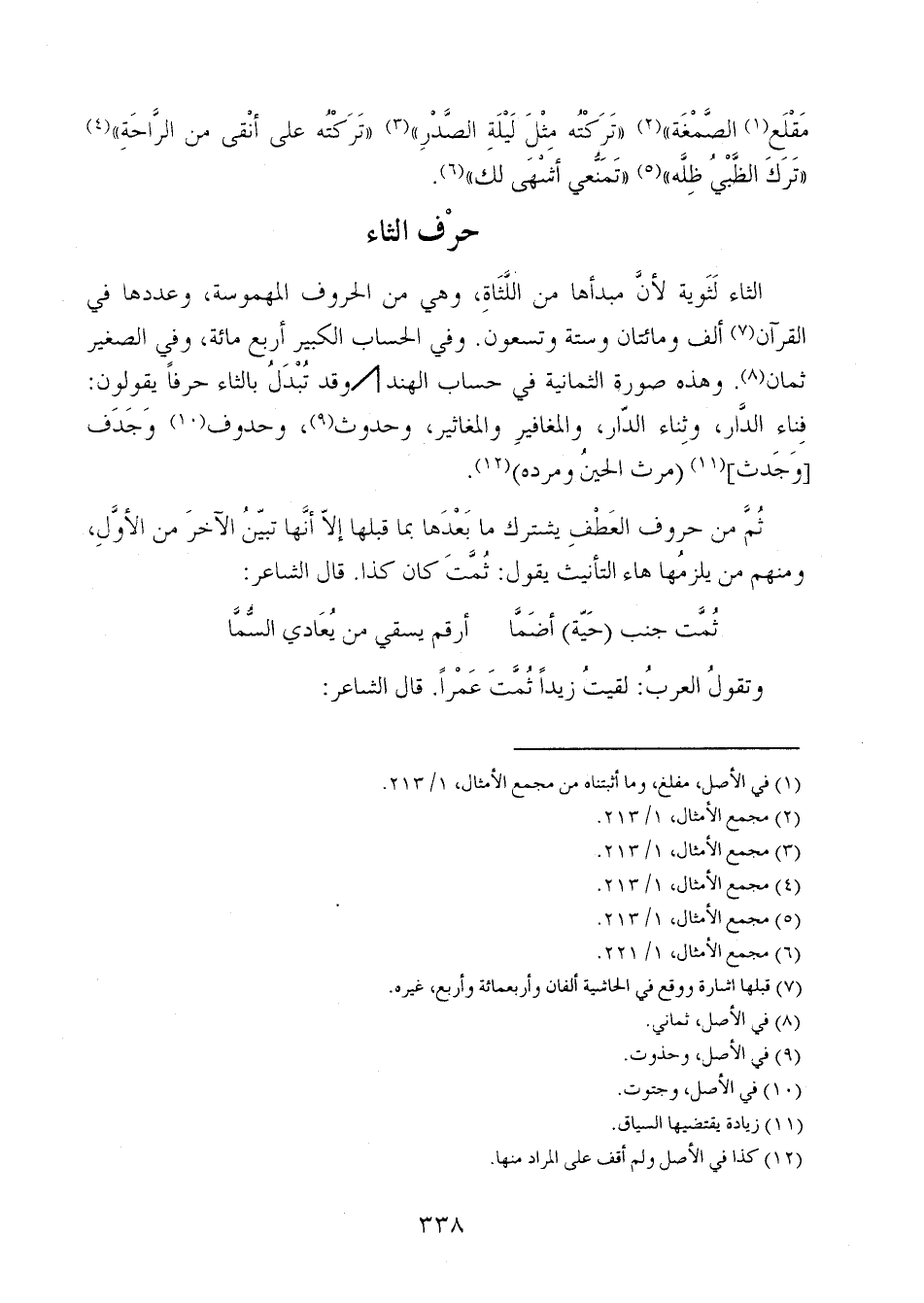 الثاء لثوية لأنَّ مبدأها من اللثاة، وهي من الحروف المهموسة، وعددها في القرآن ألف ومائتان وستة وتسعون. وفي الحساب الكبير أربع مائة، وفي الصغير ثمان. وهذه صورة الثمانية في حساب الهند وقد تُبدلُ بالثاء حرفاً يقولون: فناء الدار، وثناء الدار، والمغافير والمغاثير، وحدوث، وحدوف وجدف [وجدث] (مرث الحينُ ومرده].