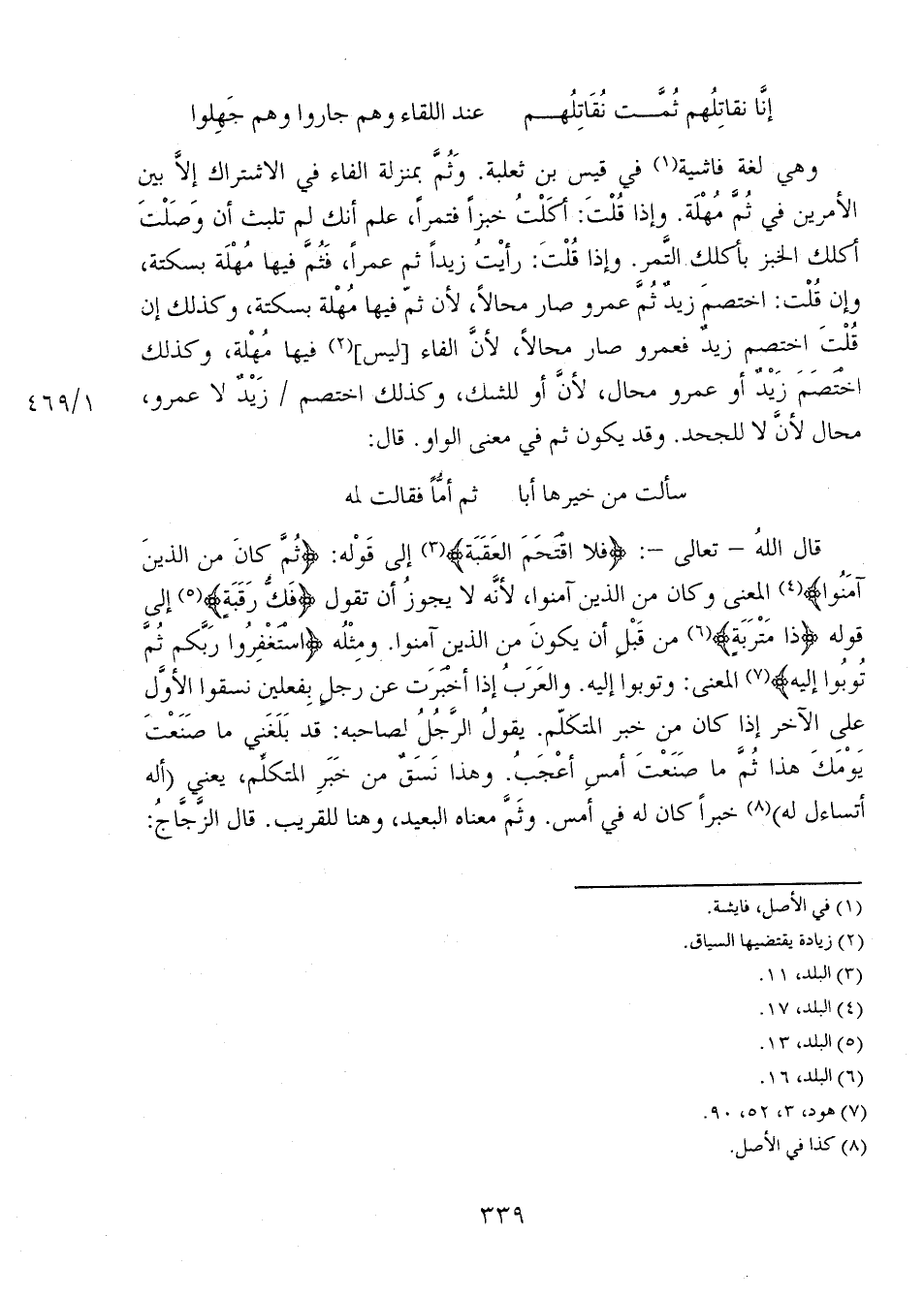 قال الله -تعالى-: {فَلا اقْتَحَمَ الْعَقَبَةَ} إلى قوله: {ثُمَّ كَانَ مِنْ الَّذِينَ آمَنُوا} المعنى وكان من الذين آمنوا، لأنه لا يجوز أن تقول {فَكُّ رَقَبَةٍ} إلى قوله {ذَا مَتْرَبَةٍ} من قبل أن يكومن من الذين آمنوا. ومثله {اسْتَغْفِرُوا رَبَّكُمْ ثُمَّ تُوبُوا إِلَيْهِ} المعنى: وتوبوا إليه. والعربُ إذا أخبرت عن رجل بفعلين نسقوا الأول على الآخر إذا كن من خبر المتكلم. يقول الرجل لصاحبه: قد بلغني ما صنعت يومك هذا ثم ما صنعت أمس أعجب. وهذا نسقٌ من خبر المتكلم، يعني (أله أتساءل له) خبراً كان له في أمس. وثم معناه البعيد، وهنا للقريب. قال الزجاج: