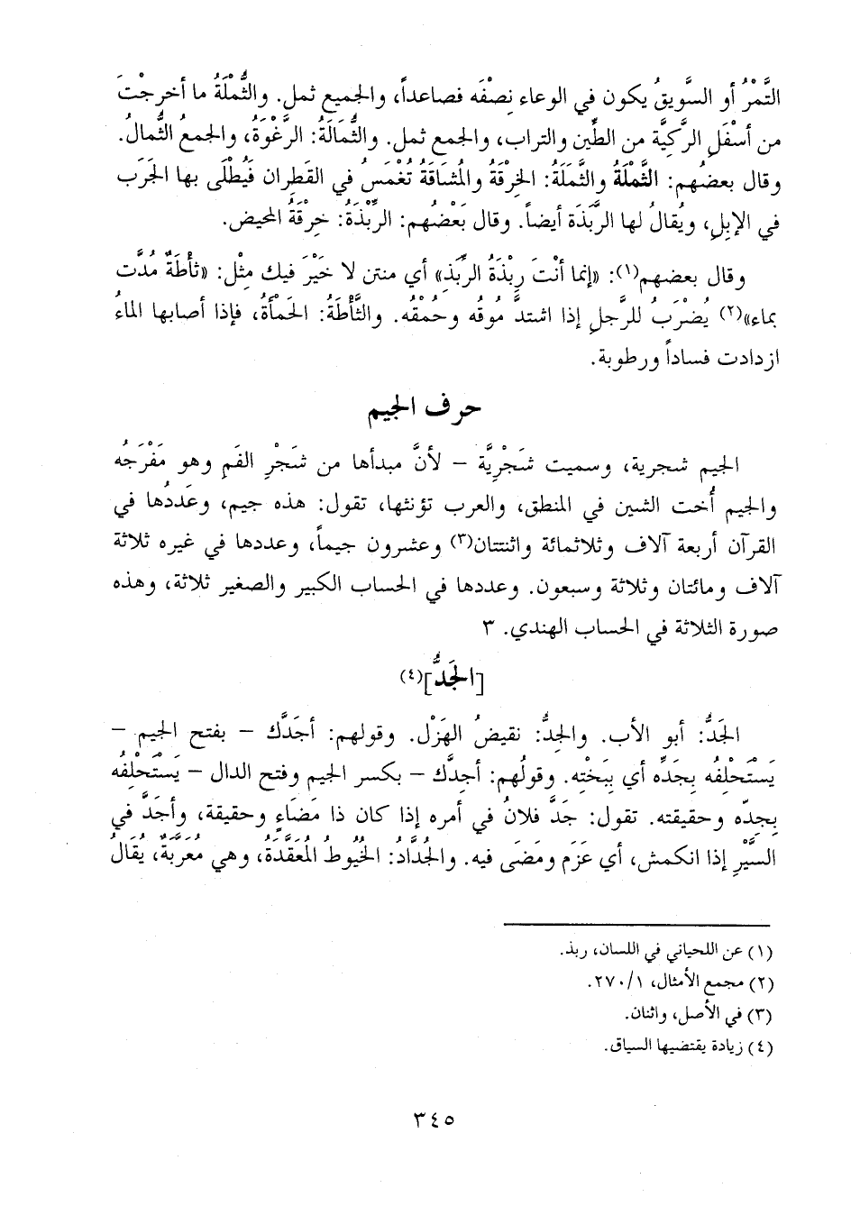 الجيم شجرية، وسميت شجرية- لأن مبدأها من شجر الفَمِ وهو مفْرَجُه والجيم أخت الشين في المنطق، والعرب تؤنثها، تقول: هذه جيم، وعددها في القرآن أربعة آلاف وثلاثمائة واثنتنان وعشرون جيماً، وعدده في غيره ثلاثة آلاف ومائتان وثلاثة وسبعون. وعددها في الحساب الكبير والصغير ثلاثة، وهذه صورة الثلاثة في الحساب الهندي.